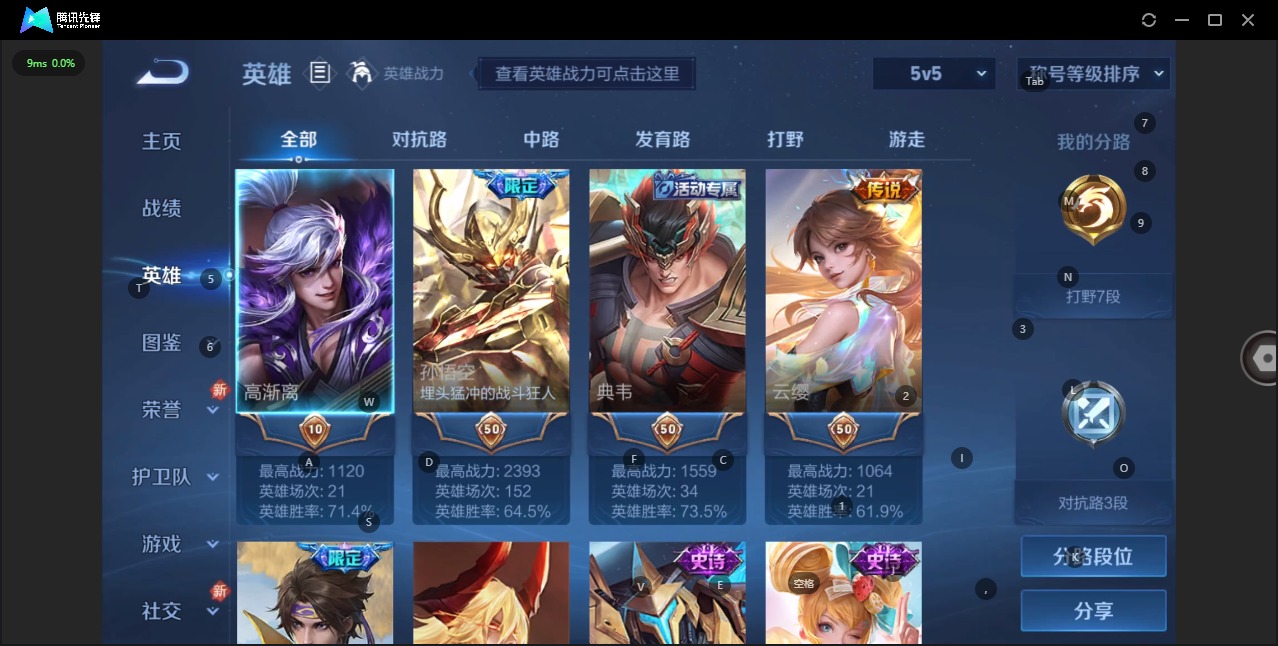 - [11686983]V7 5传说 124英雄 185皮肤 可修改实名 优质装备:黄金射手座,云霓雀翎 珍宝阁皮:蔷薇恋人,玩趣恶龙 限定皮:鸣野蒿,凤求凰(白切鸡),时雨天司(水龙头),飞衡(韩信年限),遇见飞天,游园惊梦,梁祝,御风骁将(吕布年限),李小龙,猪悟能,大圣娶亲,冰霜恋舞曲 史诗皮:石田雨龙,破空之剑,电玩小子(小书包),黄金分割率,特工魅影,千年之狐,江河有灵,冰冠公主,乱世虎臣,节奏热浪,女仆咖啡,水果甜心,天才门将,德古拉伯爵,鬼剑武藏,纤云弄巧,繁星吟游(呼啦呼啦),乘风破浪,水晶猎龙者,曙光守护者,金属风暴,鹰眼统帅,无心,未来纪元-赵云