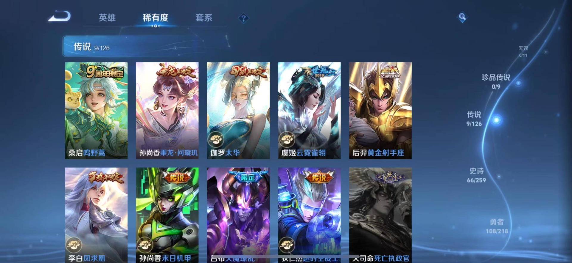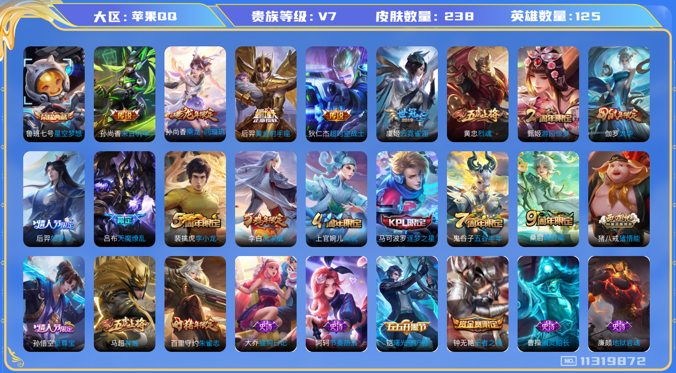 [11319872]V7 1典藏 9传说 125英雄 237皮肤 可修改实名 优质装备:星空梦想(太空人),黄金射手座,云霓雀翎,末日机甲-孙尚香(绿蚂蚱),超时空战士-狄仁杰 传说皮:乘龙·问璇玑(孙尚香年限) 珍宝阁皮:万物之道,蔷薇恋人,女武神 限定皮:鸣野蒿,至尊宝,凤求凰(白切鸡),太华(伽罗年限),神威(电光马子),五谷丰年,梁祝,逐梦之星,烈魂,李小龙,朱雀志(守约年限),如梦令-后羿,猪悟能,天魔缭乱 史诗皮:紫霞仙子,电玩小子(小书包),黄金分割率,特工魅影,江河有灵,百解令(蒙犽),蒙恬荣光圣徽,偶像歌手,魅语,无限星赏官,晚萤,冰冠公主,末日机甲-吕布,猫狗日记-孙策,猫狗日记-大乔,时之恋人-孙尚香,乱世虎臣,节奏热浪,修罗,水果甜心,星夜王子,心灵骇客,暗隐猎兽者,幽灵船长,鬼剑武藏,地狱岩魂,纤云弄巧,繁星吟游(呼啦呼啦),缤纷独角兽,逐浪之夏,水晶猎龙者,曙光守护者,箭羽风息,金属风暴,原初追逐者,圣诞狂欢,圣诞恋歌,鹰眼统帅,王者之锤,暗夜贵公子,魅力维加斯,黎明之约,无心,未来纪元-赵云