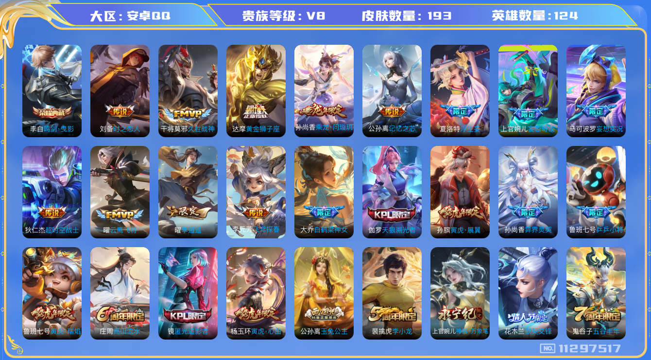 - [11605216]V8 1典藏 15传说 124英雄 193皮肤 可修改实名 优质装备:鸣剑·曳影,黄金狮子座,云鹰飞将(小将军),久胜战神,飞鸢探春,李逍遥,时之恋人-刘备(电焊工),超时空战士-狄仁杰,浮生妄,记忆之芯(机甲兔),妄想实况,妄想奇谈 传说皮:乘龙·问璇玑(孙尚香年限) 珍宝阁皮:女武神 限定皮:异界灵契(白毛香),寅虎·展翼(孙膑年限),白鹤梁神女,白晶晶,神威(电光马子),高山流水,五谷丰年,天狼溯光者,李小龙,朱雀志(守约年限),默契交锋-花木兰,乒乒小将,匿光追影者,寅虎·瑞焰(虎皮蛋子),寅虎·心曲(虎婆),玉兔公主,神器·万象笔 史诗皮:蒙犽顽岩魄,埋骨钱,怒海争锋,上官婉儿群星魔术团,蔬乡物语(鲁班七号),琥珀纪元伽罗,遇见神鹿,电玩小子(小书包),特工魅影,匿光破解者,百相守梦(刘备),电玩·爆裂旋风,鹤归松栖(赵怀真),末日机甲-莱西奥,江河有灵,百解令(蒙犽),高渐离燃音魔法,蒙恬荣光圣徽,白蛇,魅语,晚萤,末日机甲-吕布,猫狗日记-孙策,猫狗日记-大乔,时之恋人-孙尚香,乱世虎臣,节奏热浪,女仆咖啡,水果甜心,绅士熊喵,心灵骇客,暗隐猎兽者,鬼剑武藏,舞动绿茵,纤云弄巧,拒霜思,缤纷独角兽,逐浪之夏,水晶猎龙者,金属风暴,圣诞恋歌,鹰眼统帅,魅力维加斯,赏金猎手,滕王阁序,无心,未来纪元-赵云