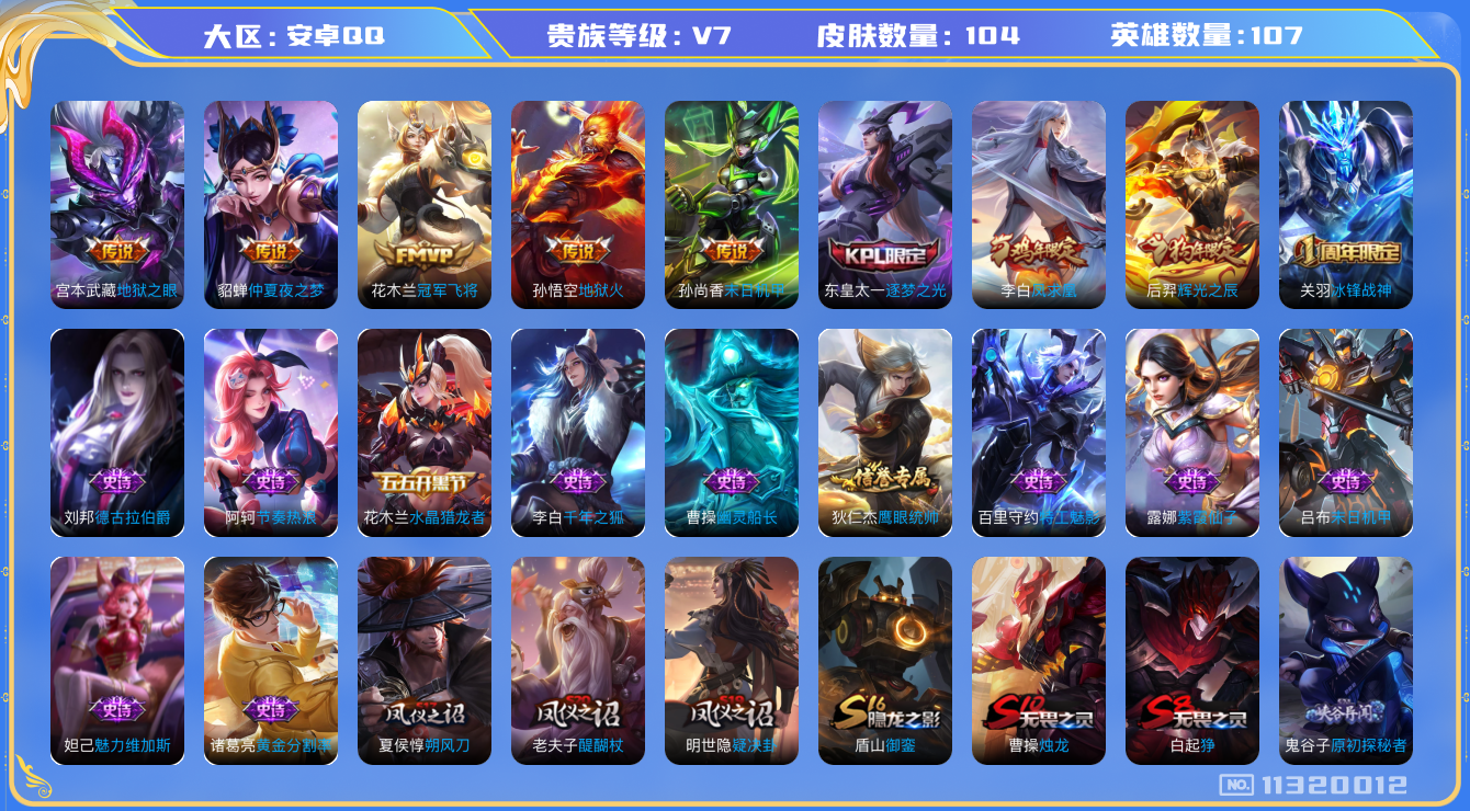 - [11497726]V7 1典藏 6传说 121英雄 279皮肤 可修改实名 荣耀水晶:鸣剑·曳影 传说皮:零号·赤焰,云鹰飞将(小将军),炽阳神光,绛天战甲(鸡嘴战神) 珍宝阁皮:蔷薇恋人,女武神 限定皮:凤求凰(白切鸡),白晶晶,时雨天司(水龙头),神威(电光马子),飞衡(韩信年限),遇见飞天,高山流水,五谷丰年,冰锋战神,游园惊梦,梁祝,天狼狩猎者,天狼绘梦者,李小龙,如梦令-后羿,霸王别姬-虞姬,默契交锋-花木兰,猪悟能,大圣娶亲,冰霜恋舞曲 史诗皮:紫霞仙子,苍穹之光,电玩小子(小书包),白龙吟,黄金分割率,千年之狐,江河有灵,蒙恬荣光圣徽,冰冠公主,偶像歌手,龙骑士(小龙虾),末日机甲-吕布,乱世虎臣,修罗,女仆咖啡,水果甜心,绅士熊喵,星夜王子,心灵骇客,功夫厨神,德古拉伯爵,暗隐猎兽者,鬼剑武藏,心灵战警,舞动绿茵,地狱岩魂,纤云弄巧,繁星吟游(呼啦呼啦),拒霜思,缤纷独角兽,乘风破浪,逐浪之夏,水晶猎龙者,金属风暴,原初追逐者,圣诞狂欢,圣诞恋歌,鹰眼统帅,魅力维加斯,黎明之约,未来纪元-赵云