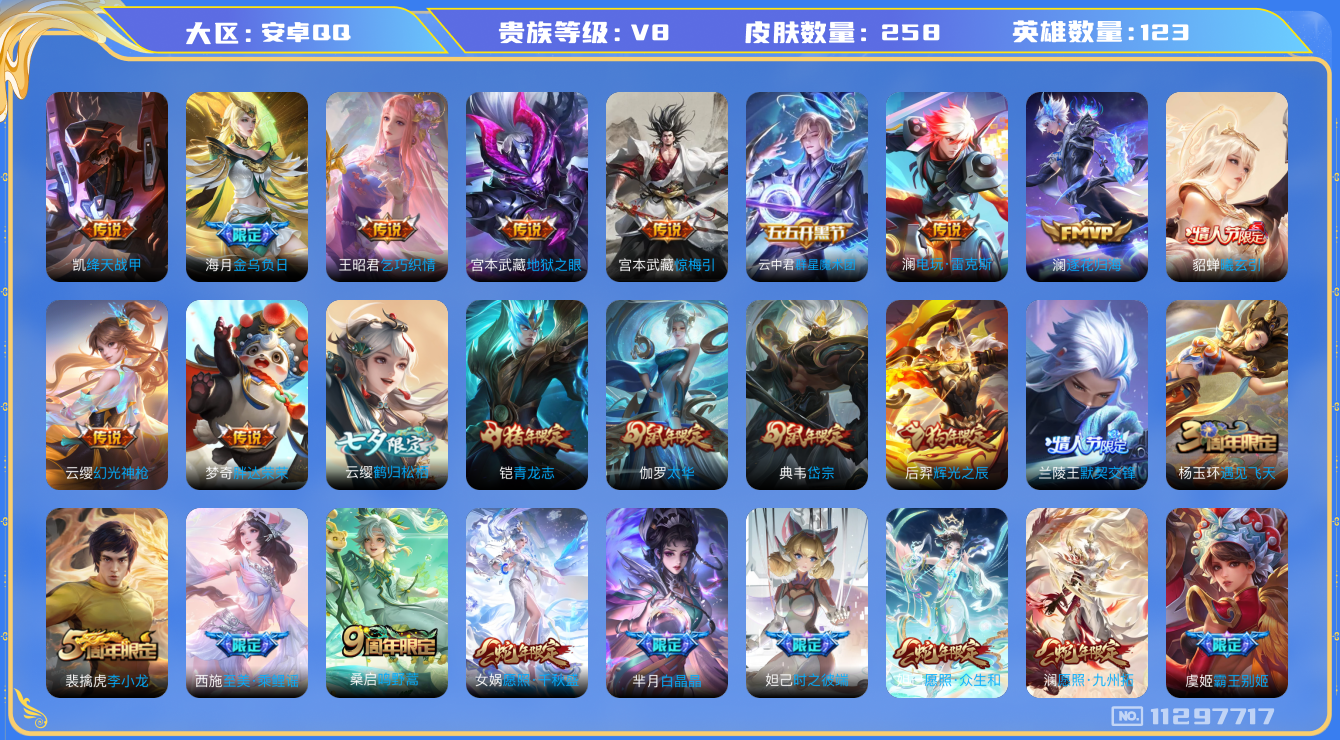 [11297717]V8 20传说 123英雄 258皮肤 可修改实名 优质装备:绛天战甲(鸡嘴战神),地狱之眼,胖达荣荣,乞巧织情,电玩·雷克斯,鹤归松栖(云缨),惊梅引,澜逐花归海,金乌负日,云中君群星魔术团 传说皮:貂蝉曦玄引,幻光神枪 珍宝阁皮:妄想食味 限定皮:愿照·九州拓(澜年限),愿照·岁时盈(虞姬年限),愿照·众生和(妲己年限),愿照·千秋盛(女娲年限),鸣野蒿,太华(伽罗年限),时之彼端,白晶晶,至美·乘鲤谣,遇见飞天,青龙志(铠年限),岱宗(典韦年限),李小龙,辉光之辰,霸王别姬-虞姬,默契交锋-兰陵王 史诗皮:鸭鸭历险记-刘禅,器灵·浮梦炉,化蝶舞,星界战将,龙之律动,茶境仙,破空之剑,涂山红红,东方月初,埋骨钱,怒海争锋,上官婉儿群星魔术团,蔬乡物语(鲁班七号),百相守梦-黄忠,紫霞仙子,黄金分割率,特工魅影,千年之狐,浮梦罗烟,江河有灵,百解令(蒙犽),高渐离燃音魔法,蒙恬荣光圣徽,偶像歌手,魅语,晚萤,猫狗日记-大乔,节奏热浪,修罗,摇滚巨星,水果甜心,绅士熊喵,心灵骇客,功夫厨神,幽灵船长,鬼剑武藏,心灵战警,地狱岩魂,纤云弄巧,拒霜思,乘风破浪,逐浪之夏,水晶猎龙者,曙光守护者,箭羽风息,金属风暴,圣诞狂欢,鹰眼统帅,魅力维加斯,赏金猎手,滕王阁序,未来纪元-赵云