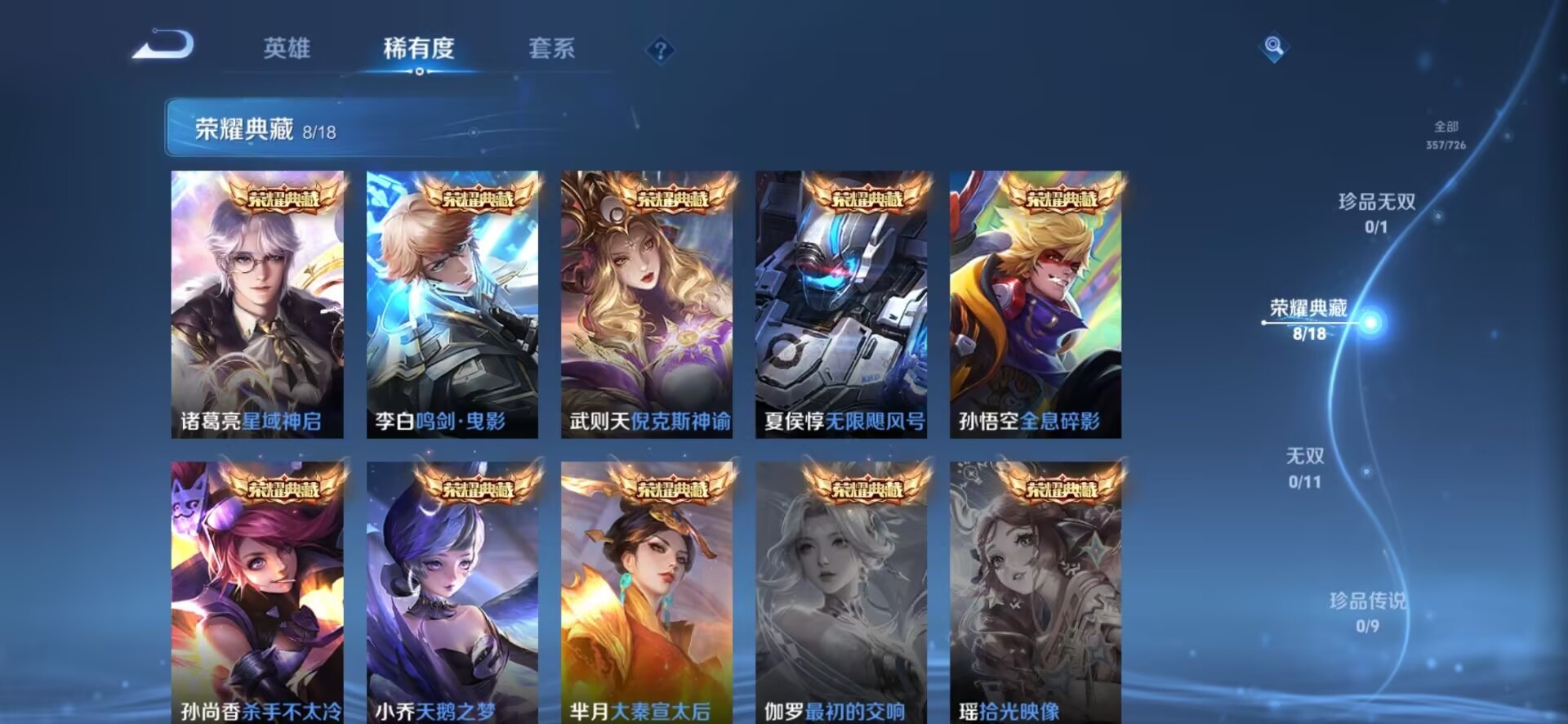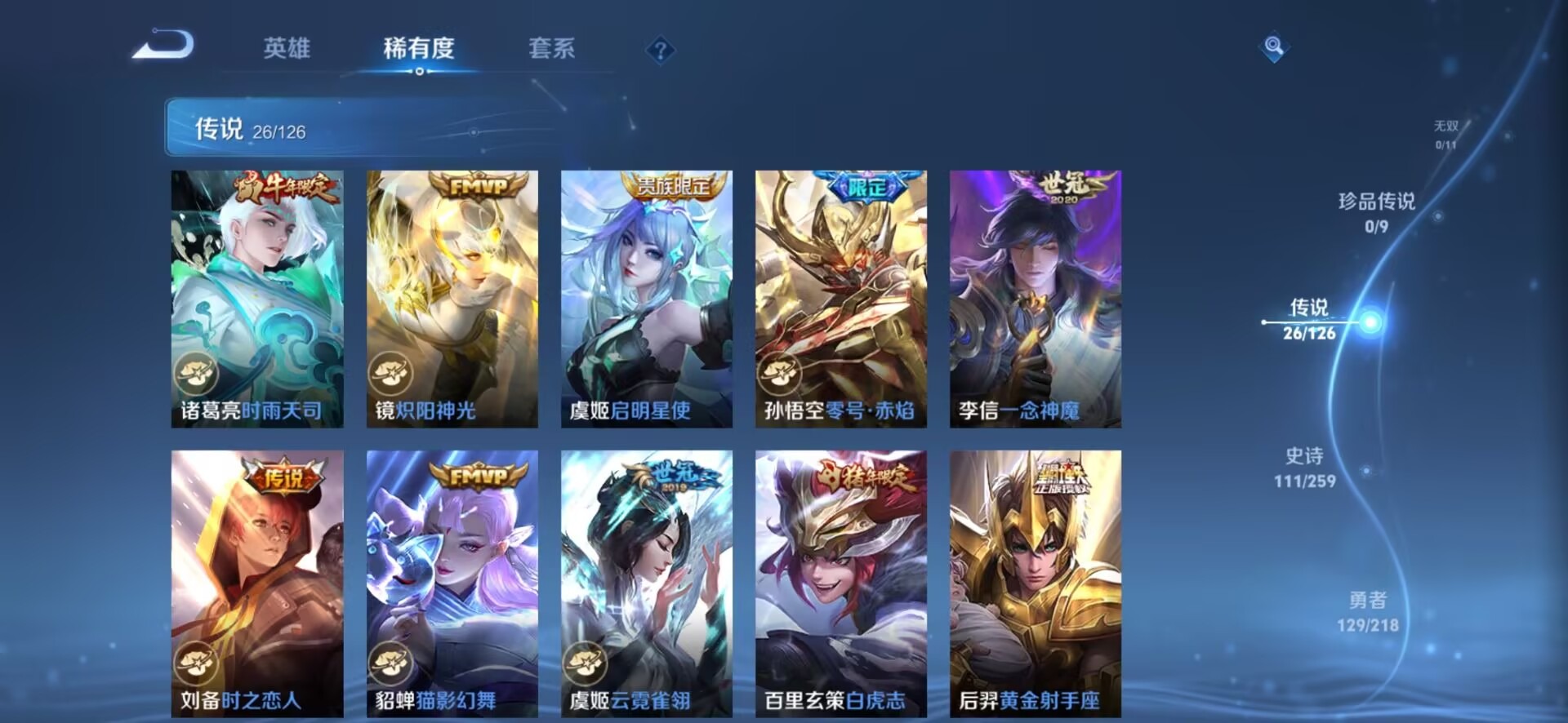 大乔白鹤梁神女,伽罗天狼溯光者,赵云百木心枪,干将莫邪冰霜恋舞曲,项羽霸王别姬,吕布御风骁将,后羿如梦令,露娜启示之音,后羿辉光之辰,露娜一生所爱,镜匿光追影者,诸葛亮时雨天司,兰陵王默契交锋,裴擒虎李小龙,裴擒虎寅虎·赤拳,上官婉儿梁祝,上官婉儿天狼绘梦者,花木兰默契交锋,花木兰瑞麟志,花木兰青春决赛季,马可波罗逐梦之星,桑启鸣野蒿,孙悟空孙行者,孙悟空大圣娶亲,芈月白晶晶,孙悟空至尊宝,百里玄策白虎志,韩信傲雪梅枪,百里守约朱雀志,王昭君凤凰于飞,关羽冰锋战神