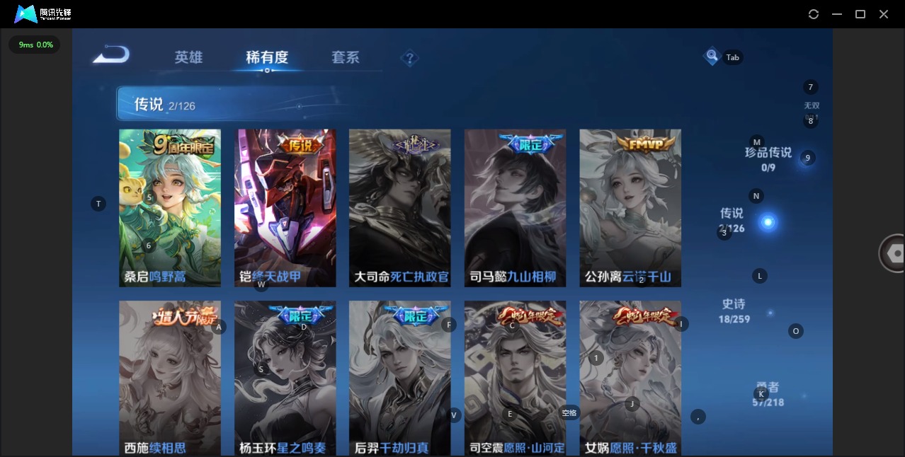 - PX_2057207-贵族等级: V7 英雄数: 124 皮肤数: 227 星传说: 零号·雷霆 传说皮: 炽阳神光,末日机甲-孙尚香,零号·赤焰,霜月吟,牧神诗旅,祥瑞亨通 限定皮: 冰锋战神,李小龙,御风骁将,神威,时之彼端,飞衡,天狼绘梦者,至尊宝,孙行者,鸣野蒿,逐霄战戟,愿照·九州拓