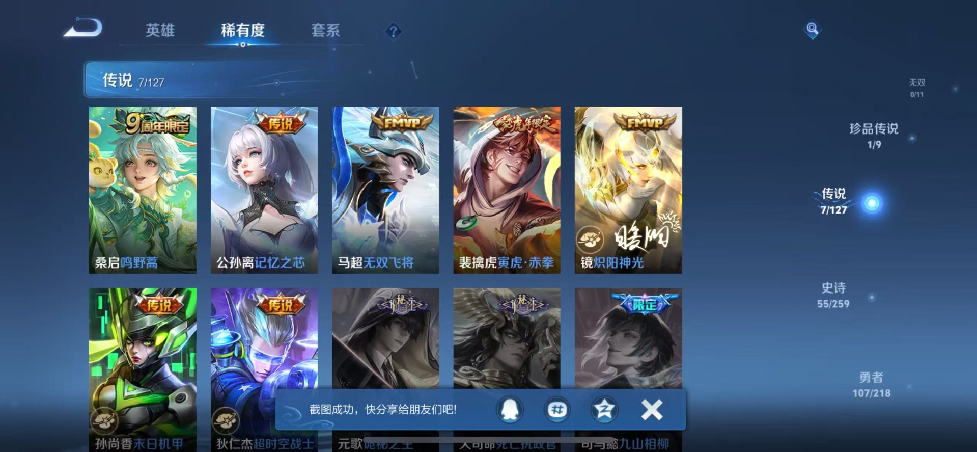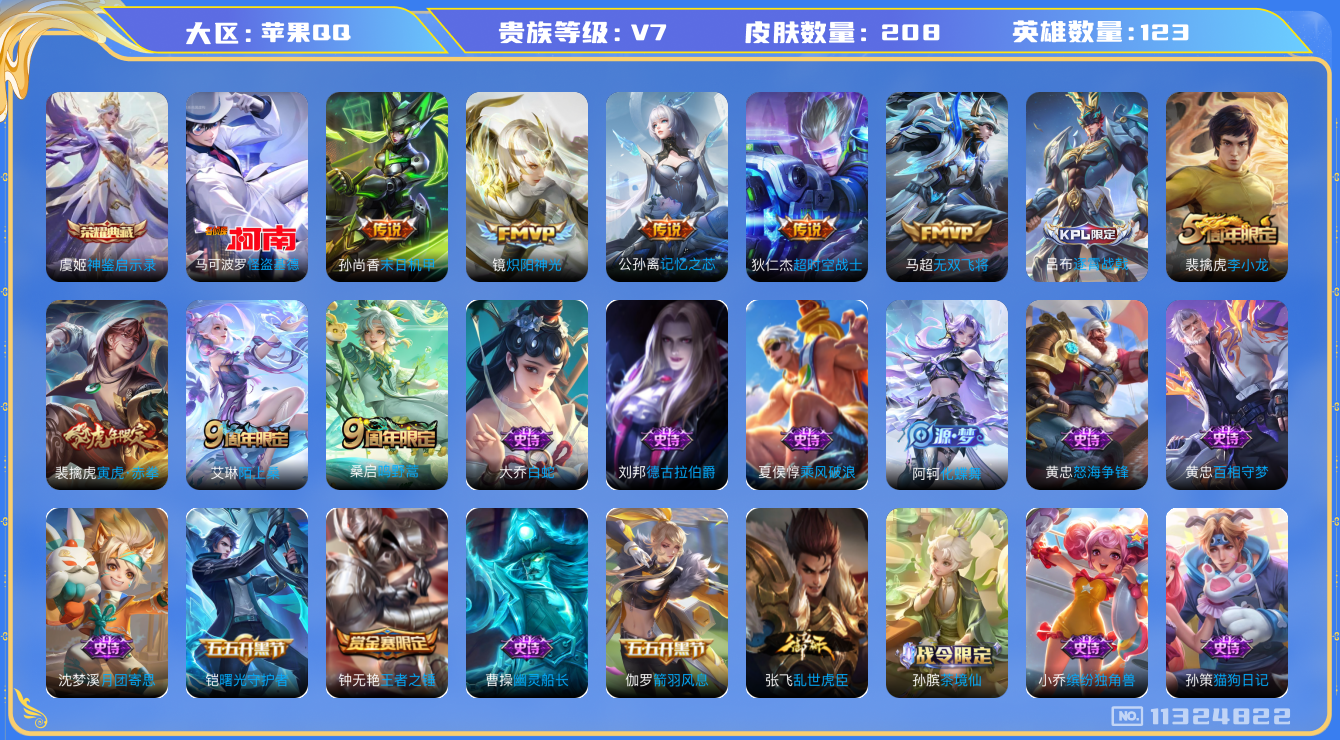 [11324822]V7 1典藏 1珍品传说 7传说 123英雄 208皮肤 可修改实名 优质装备:神鉴启示录,怪盗基德,炽阳神光,末日机甲-孙尚香(绿蚂蚱),超时空战士-狄仁杰,无双飞将,记忆之芯(机甲兔) 珍宝阁皮:妄想食味 限定皮:逐霄战戟,陌上桑,鸣野蒿,李小龙,寅虎·赤拳(老虎年限) 史诗皮:化蝶舞,星界战将,谪仙醉月,龙之律动,石田雨龙,茶境仙,怒海争锋,炽弈燎原,破空之剑,东方月初,埋骨钱,百相守梦-百里守约,百相守梦-黄忠,紫霞仙子,千年之狐,江河有灵,百解令(蒙犽),蒙恬荣光圣徽,无限星赏官,冰冠公主,偶像歌手,白蛇,猫狗日记-孙策,乱世虎臣,修罗,女仆咖啡,摇滚巨星,水果甜心,星夜王子,德古拉伯爵,幽灵船长,鬼剑武藏,天秀·启明,纤云弄巧,缤纷独角兽,乘风破浪,逐浪之夏,月团寄思,水晶猎龙者,曙光守护者,箭羽风息,原初追逐者,圣诞恋歌,鹰眼统帅,王者之锤,魅力维加斯,黎明之约