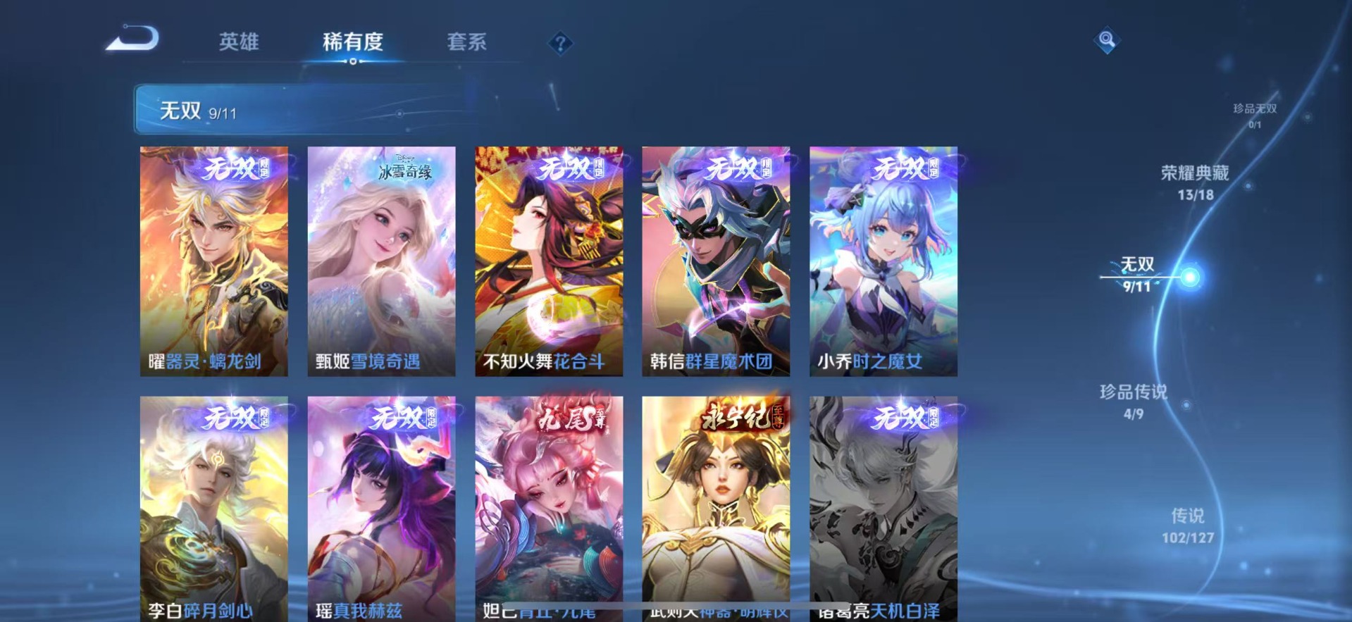 小乔天鹅之梦,诸葛亮星域神启,花木兰九霄神辉,韩信弑枪猎影,虞姬神鉴启示录,貂蝉幻阙歌,铠银白咏叹调,伽罗最初的交响,鲁班七号星空梦想,武则天倪克斯神谕,李白鸣剑·曳影,瑶拾光映像,关羽赤影疾锋