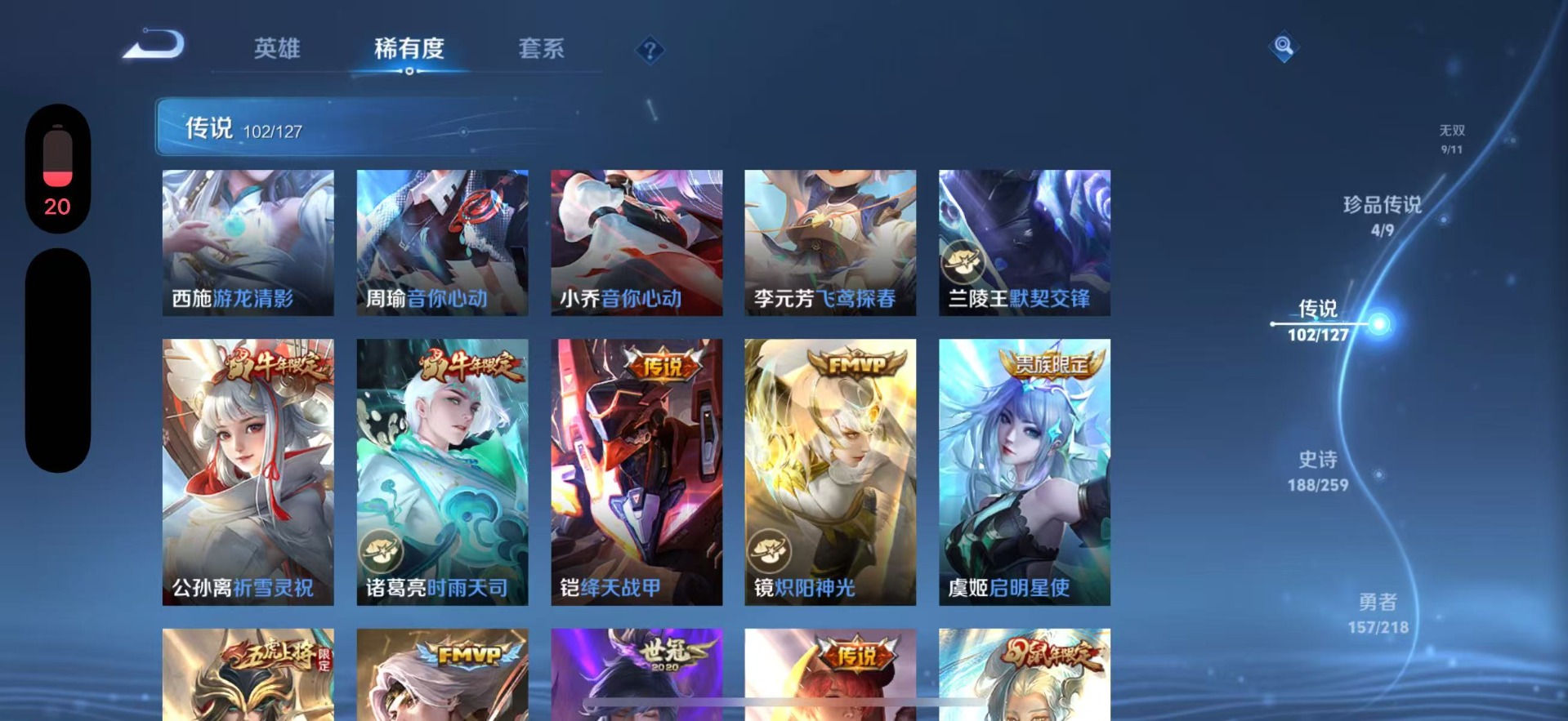 - [12202299]V9 1典藏 2珍品传说 32传说 126英雄 392皮肤 典藏英雄武则天 女号 可修改实名 优质装备:全息碎影(猴子典藏),器灵·落星盏,大耳狗之梦,黄金射手座,冠军飞将,云鹰飞将(小将军),黄金白羊座,猫影幻舞,久胜战神,一念神魔,云霓雀翎,末日机甲-孙尚香(绿蚂蚱),仲夏夜之梦(大飞蛾),海洋之心,地狱之眼,超时空战士-狄仁杰,末日机甲-孙策 传说皮:云诺千山,续相思,幻光神枪 珍宝阁皮:优雅恋人,玩趣恶龙 限定皮:愿照·九州拓(澜年限),愿照·福禄聚(蔡文姬年限),愿照·岁时盈(虞姬年限),愿照·山河定(司空震年限),愿照·众生和(妲己年限),至尊宝,白虎志(电光耗子),凤求凰(白切鸡),凤凰于飞,太华(伽罗年限),梅西,武陵仙君(小桃花),寅虎·展翼(孙膑年限),时之彼端,魔法小厨娘,神威(电光马子),飞衡(韩信年限),山海·碧波行(瑶年限),瑞麟志(木兰年限),遇见飞天,高山流水,冰锋战神,武圣,游园惊梦,梁祝,天狼狩猎者,龙胆,天狼溯光者,虎魄,逐梦之音,天狼征服者,祈雪灵祝(雪兔子),天狼绘梦者,李小龙,逐梦之影,逐梦之光,永曜之星,如梦令-嫦娥,霸王别姬-虞姬,孙行者,猪悟能,一生所爱,大圣娶亲,引擎之心,天魔缭乱,青春决赛季,冰霜恋舞曲,云端筑梦师,蜜橘之夏,神奇女侠,美猴王,时之祈愿-瑶(瑶传限) 史诗皮:器灵·浮梦炉,化蝶舞,龙之律动,灵蛊蚀心,石田雨龙,百相守梦-周瑜,百相守梦-黄忠,幻珠鲛人,织梦人,遇见神鹿,紫霞仙子,苍穹之光,电玩小子(小书包),白龙吟,黄金分割率,特工魅影,千年之狐,冰冠公主,魅语,无限星赏官,晚萤,偶像歌手,龙骑士(小龙虾),暗夜猫娘,末日机甲-吕布,猫狗日记-孙策,猫狗日记-大乔,时之恋人-孙尚香,乱世虎臣,节奏热浪,修罗,女仆咖啡,摇滚巨星,水果甜心,绅士熊喵,天才门将,星夜王子,心灵骇客,时之奇旅-安琪拉,功夫厨神,德古拉伯爵,暗隐猎兽者,幽灵船长,鬼剑武藏,心灵战警,天秀·启明,舞动绿茵,地狱岩魂,诗语江南,纤云弄巧,繁星吟游(呼啦呼啦),拒霜思,缤纷独角兽,乘风破浪,逐浪之夏,水晶猎龙者,曙光守护者,箭羽风息,唤灵魅影,金属风暴,原初追逐者,圣诞狂欢,圣诞恋歌,鹰眼统帅,王者之锤,暗夜贵公子,魅力维加斯,黎明之约,未来纪元-赵云
