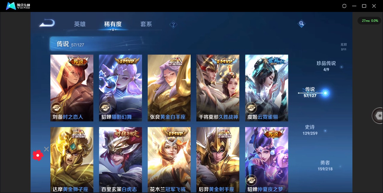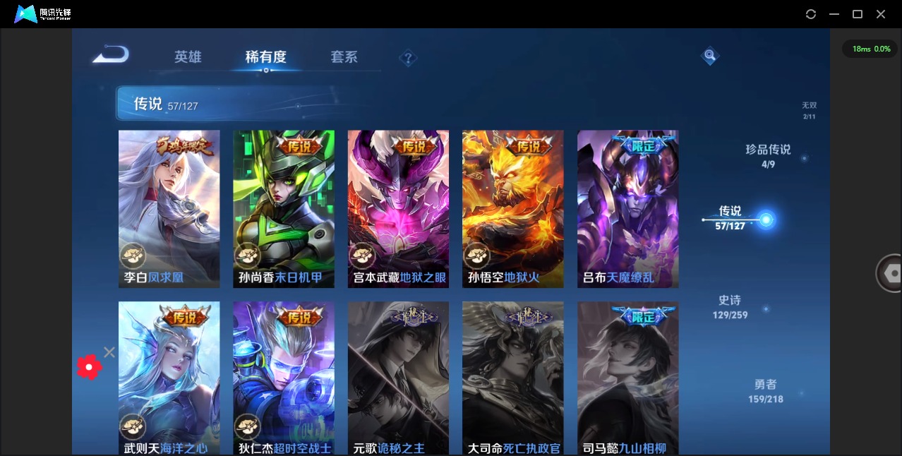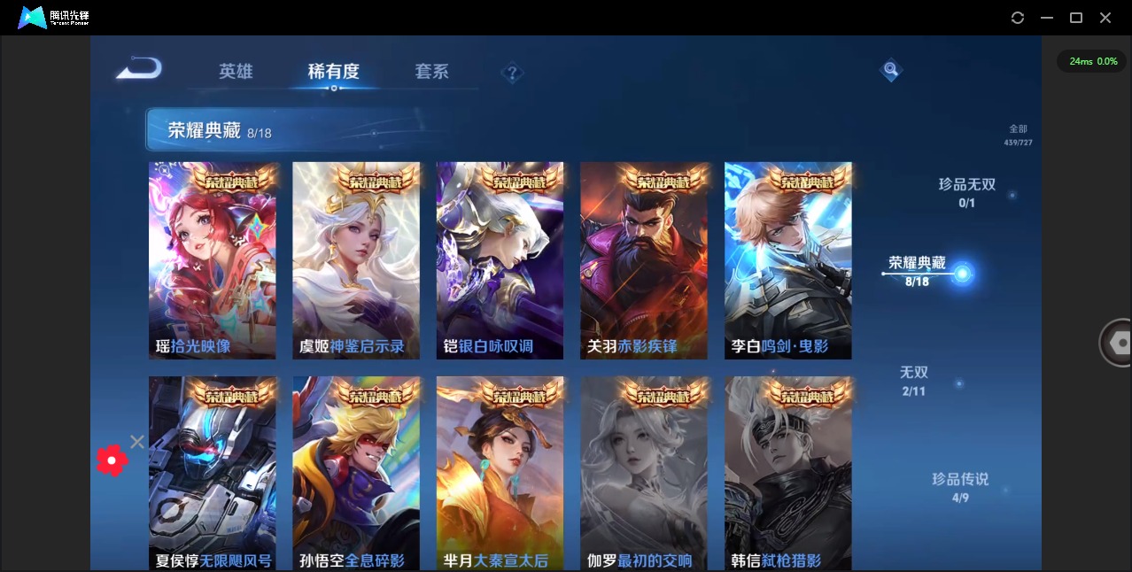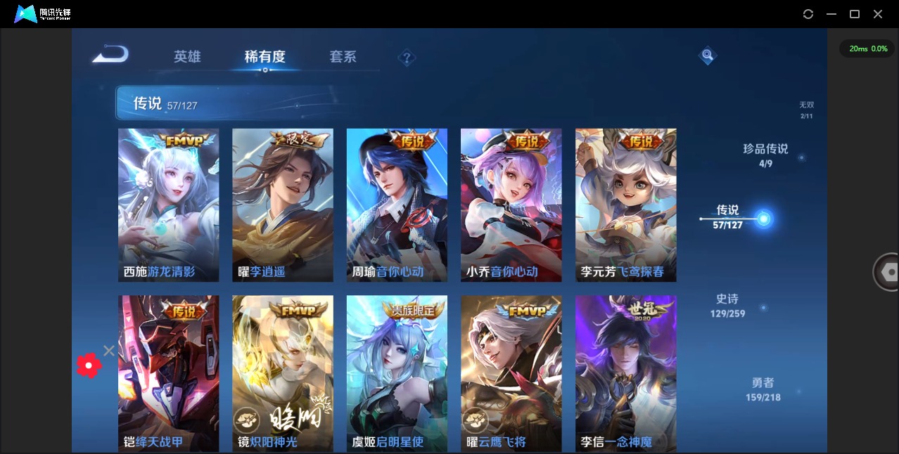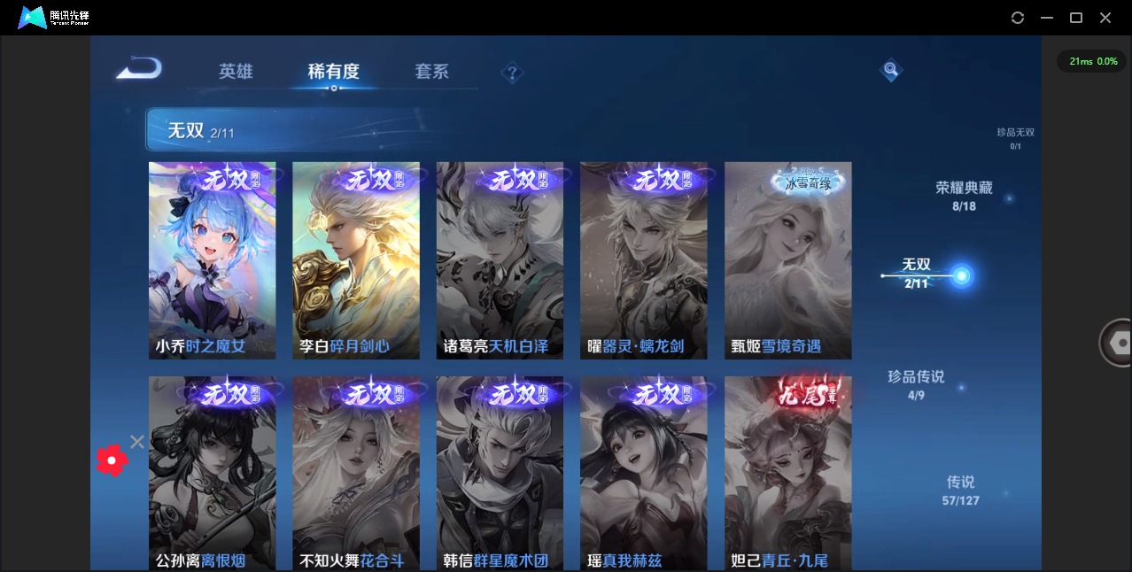 - PX_2110012-Q/无双王者/463皮肤/126英雄/2典藏/0珍品无双/4无双/5珍品传说/50传说/150史诗/10稀有英雄 【5 珍品传说】酷洛米之心 安琪拉,大耳狗之梦 瑶,怪盗基德 马可波罗,器灵·落星盏 嫦娥,兔狲·蓬尾 张飞, 【2 典藏皮肤】天鹅之梦 小乔,幻阙歌 貂蝉, 【4 无双皮肤】天机白泽 诸葛亮,时之魔女 小乔,花合斗 不知火舞,器灵·螭龙剑 曜, 【50 传说皮肤