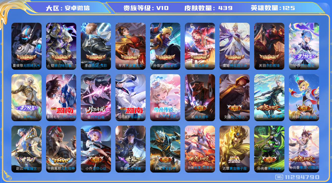 [11294790]V10 8典藏 2无双 4珍品传说 57传说 125英雄 439皮肤 典藏英雄武则天 可修改实名 安全保护中 优质装备:无限飓风号(高达),大秦宣太后,鸣剑·曳影,全息碎影(猴子典藏),赤影疾锋,银白咏叹调(倪克斯侍卫),碎月剑心(李白无双),神鉴启示录,小乔时之魔女(小乔无双),拾光映像(瑶典藏),江户川柯南,怪盗基德,大耳狗之梦,朽木白哉,黄金狮子座,黄金射手座,冠军飞将,云鹰飞将(小将军),绛天战甲(鸡嘴战神),黄金白羊座,猫影幻舞,久胜战神,炽阳神光,一念神魔,云霓雀翎,末日机甲-孙尚香(绿蚂蚱),地狱火,仲夏夜之梦(大飞蛾),音你心动-小乔,海洋之心,地狱之眼,飞鸢探春,音你心动-周瑜,李逍遥,乞巧织情,时之恋人-刘备(电焊工),游龙清影(小青龙),淬星耀世,超时空战士-狄仁杰,末日机甲-孙策,花朝如约(花篮子),无双飞将,碎云,天秀幻梦,山海·苍雷引(电光曜子),记忆之芯(机甲兔),电玩·雷克斯,灼幽烈阳,惊梅引,遇见神鼓,小动物乐团,澜逐花归海,艾琳觅芳踪,琥珀纪元马超,金乌负日,朵莉亚心动手记,牧神诗旅 传说皮:乘龙·问璇玑(孙尚香年限),乘龙·铭钟鼎(赵云年限),乘龙·淬吴钩(孙策年限),祥瑞亨通,幻光神枪 珍宝阁皮:蔷薇恋人,玩趣恶龙 限定皮:愿照·九州拓(澜年限),逐霄战戟,鸣野蒿,白虎志(电光耗子),凤求凰(白切鸡),前尘镜,神威(电光马子),飞衡(韩信年限),至美·乘鲤谣,至美·化雀舞,遇见飞天,诗剑行,五谷丰年,青龙志(铠年限),冰锋战神,幽恒(沐浴露),逐梦之星,烈魂,奔雷神使(牛魔年限),李小龙,朱雀志(守约年限),辉光之辰,霸王别姬-项羽,奇迹圣诞,孙行者,猪悟能,天魔缭乱,冰霜恋舞曲,寅虎·心曲(虎婆),寅虎·赤拳(老虎年限),玉兔公主 史诗皮:鸭鸭历险记-刘禅,星界特工,星界战将,灵蛊蚀心,石田雨龙,茶境仙,海诺心动手记,奇遇星旅,曹操夜都魔契,乘龙·聚宝船(安琪拉年限),乘龙·忆丹青(大乔年限),琥珀纪元伽罗,百相守梦-百里守约,百相守梦-黄忠,遇见神鹿,紫霞仙子,苍穹之光,电玩小子(小书包),白龙吟,黄金分割率,特工魅影,千年之狐,永昼,真我赫兹(镜),末日机甲-莱西奥,江河有灵,高渐离燃音魔法,银翎春语,蒙恬荣光圣徽,偶像歌手,龙骑士(小龙虾),白蛇,暗夜猫娘,魅语,无限星赏官,晚萤,冰冠公主,青蛇,