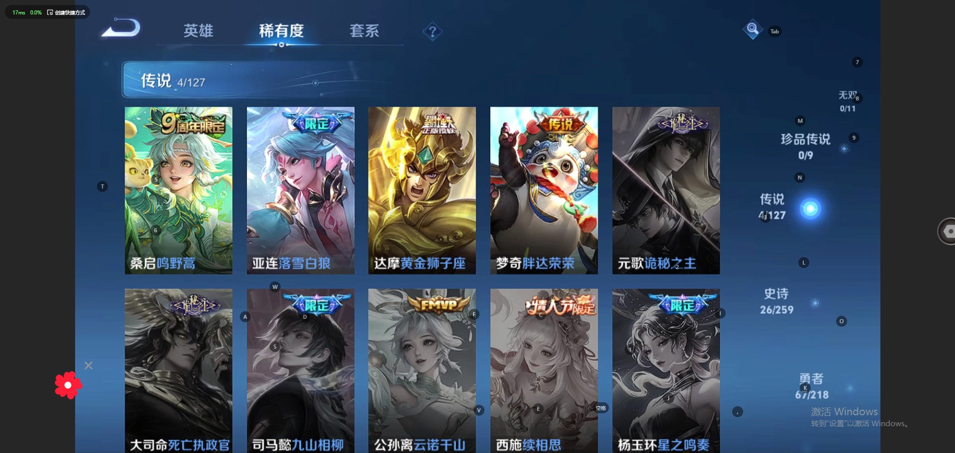 - PX_2081856-贵族5/皮肤145/传说5/史诗37/英雄123/蔷薇恋人/特工战影/乘龙铭钟鼎/乘龙问璇玑/金乌负日/桑启鸣野蒿/云缨幻光神枪/姜子牙天穹之誓/杨戬破阵退雄兵/狄仁杰阴阳师/赵云皇家上将/蔷薇恋人/高渐离死亡摇滚/蓝屏警告/岱宗/暗影游猎/万华元夜/沙漠行僧/项羽海滩派对/金庭之子/云中旅人/千军破阵/原初追逐者/大漠名商/擒涛扼浪/云中君纤云弄巧/梁祝/拒霜思/探海日志/
