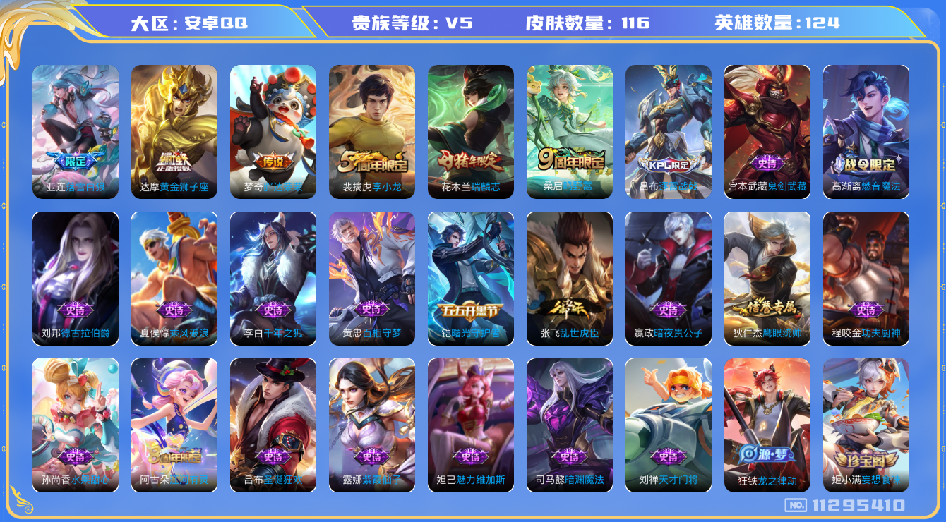 - [11934710]V10 3典藏 6无双 4珍品传说 53传说 125英雄 458皮肤 可修改实名 优质装备:天鹅之梦(小乔典藏),幻阙歌(貂蝉典藏),真我赫兹(瑶)(瑶无双),青丘·九尾(妲己无双),小乔时之魔女(小乔无双),花合斗,离恨烟(公孙离无双),拾光映像(瑶典藏),雪境奇遇-甄姬,江户川柯南,怪盗基德,器灵·落星盏,云鹰飞将(小将军),猫影幻舞,炽阳神光,末日机甲-孙尚香(绿蚂蚱),地狱火,仲夏夜之梦(大飞蛾),音你心动-小乔,地狱之眼,音你心动-周瑜,胖达荣荣,乞巧织情,游龙清影(小青龙),淬星耀世,挚爱之约,挚爱花嫁,山海·琳琅生(小乔年限),记忆之芯(机甲兔),青丘·九尾,追逃游戏(安琪拉),妄想奇谈,鹤归松栖(云缨),大乔-时之奇旅,永恒水手月亮,小动物乐团,艾琳觅芳踪,金乌负日,朵莉亚心动手记,牧神诗旅,玄雷天君,涂山容容 珍品传说:时之奇旅-孙策 传说皮:乘龙·问璇玑(孙尚香年限),貂蝉曦玄引,云诺千山,续相思,星之鸣奏,幻光神枪 珍宝阁皮:妄想食味,蔷薇恋人 限定皮:愿照·九州拓(澜年限),愿照·福禄聚(蔡文姬年限),愿照·岁时盈(虞姬年限),愿照·山河定(司空震年限),愿照·众生和(妲己年限),愿照·千秋盛(女娲年限),逐霄战戟,映山客,陌上桑,鸣野蒿,夏侯惇霜北刀,凤凰于飞,太华(伽罗年限),异界灵契(白毛香),傲雪梅枪,寅虎·展翼(孙膑年限),前尘镜,星穹之声,绯月行,时之彼端,白鹤梁神女,魔法小厨娘,时雨天司(水龙头),山海·碧波行(瑶年限),至美·乘鲤谣,遇见飞天,五谷丰年,天狼运算者,虎魄,逐梦之音,祈雪灵祝(雪兔子),如梦令-嫦娥,孙行者,猪悟能,冰霜恋舞曲,云端筑梦师,蜜橘之夏,美猴王,女儿国国王,寅虎·心曲(虎婆),时之祈愿-瑶(瑶传限),玉兔公主,启示之音,唐三藏,神器·万象笔 史诗皮:鸭鸭历险记-刘禅,飞车小橘子,苍鳞隐世,器灵·浮梦炉,糖绘人间,狼魂孤将,绮世丹青,瑰影绮梦,化蝶舞,灵蛊蚀心,谪仙醉月,龙之律动,石田雨龙,百相守梦-周瑜,茶境仙,幻珠鲛人,怒海争锋,炽弈燎原,破空之剑,战舞者,涂山红红,东方月初,蒙犽顽岩魄,埋骨钱,芈月浮光幕影,海诺心动手记,琥珀纪元伽罗,决胜骁骑,上官婉儿群星魔术团,奇遇星旅,蔬乡物语(鲁班七号),曹操夜都魔契,乘龙·聚宝船(安琪拉年限),乘龙·忆丹青(大乔年限),百相守梦-百里守约,星界特工,