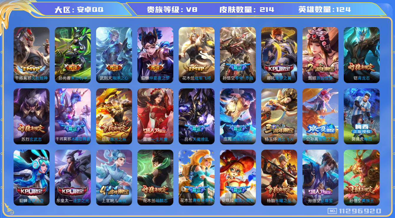 [11296920]V8 10传说 124英雄 214皮肤 典藏英雄武则天 可修改实名 女号 优质装备:冠军飞将,久胜战神,末日机甲-孙尚香(绿蚂蚱),仲夏夜之梦(大飞蛾),零号·赤焰,海洋之心 限定皮:至尊宝,白虎志(电光耗子),梅西,魔法小厨娘,瑞麟志(木兰年限),遇见飞天,青龙志(铠年限),冰锋战神,游园惊梦,梁祝,逐梦之翼,逐梦之音,逐梦之影,逐梦之光,玄武志(苏烈年限),朱雀志(守约年限),永曜之星,辉光之辰,霸王别姬-虞姬,奇迹圣诞,一生所爱,引擎之心,天魔缭乱,青春决赛季,冰霜恋舞曲,云端筑梦师,蜜橘之夏,热情桑巴,神奇女侠,美猴王 史诗皮:东方月初,紫霞仙子,电玩小子(小书包),黄金分割率,千年之狐,偶像歌手,末日机甲-吕布,猫狗日记-孙策,猫狗日记-大乔,乱世虎臣,摇滚巨星,水果甜心,星夜王子,心灵骇客,暗隐猎兽者,纤云弄巧,繁星吟游(呼啦呼啦),缤纷独角兽,水晶猎龙者,箭羽风息,金属风暴,原初追逐者,圣诞恋歌,鹰眼统帅,魅力维加斯,未来纪元-赵云