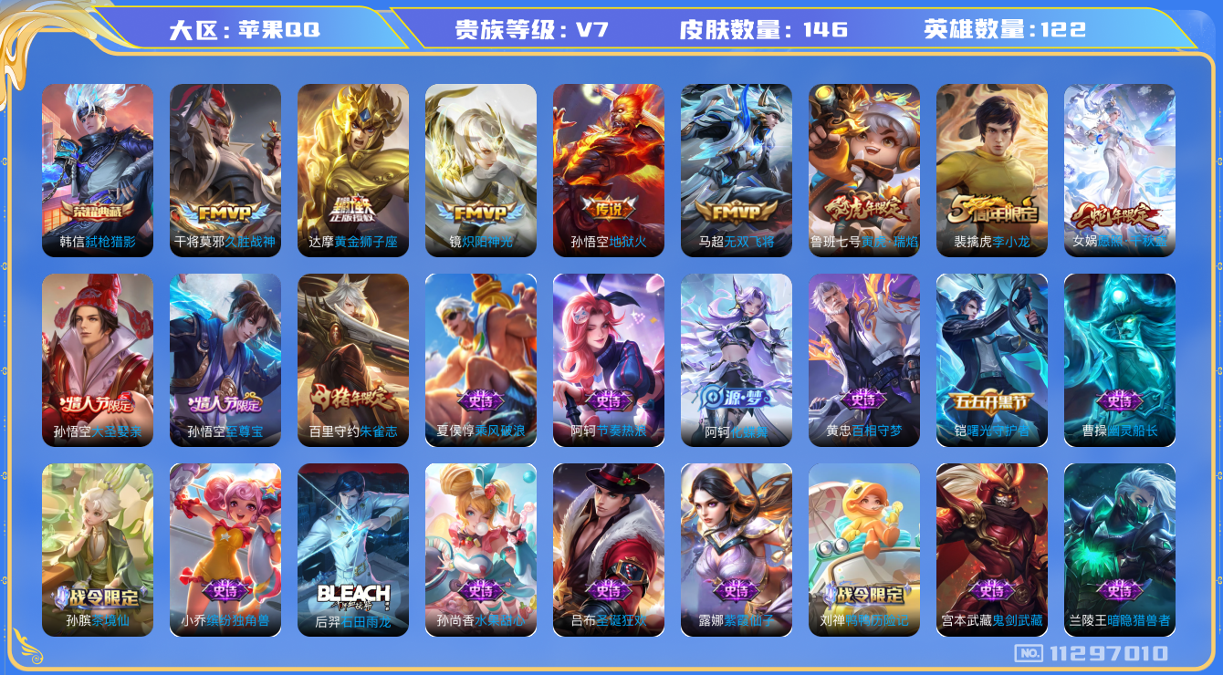 [11297010]V7 1典藏 7传说 122英雄 146皮肤 可修改实名 优质装备:弑枪猎影(韩信典藏),黄金狮子座,久胜战神,炽阳神光,地狱火,无双飞将 珍宝阁皮:蔷薇恋人 限定皮:愿照·千秋盛(女娲年限),至尊宝,李小龙,朱雀志(守约年限),大圣娶亲,寅虎·瑞焰(虎皮蛋子) 史诗皮:鸭鸭历险记-刘禅,绮世丹青,化蝶舞,星界特工,龙之律动,石田雨龙,茶境仙,百相守梦-黄忠,紫霞仙子,特工魅影,千年之狐,偶像歌手,龙骑士(小龙虾),节奏热浪,女仆咖啡,水果甜心,暗隐猎兽者,幽灵船长,鬼剑武藏,乐园奇幻夜,缤纷独角兽,乘风破浪,曙光守护者,圣诞狂欢,鹰眼统帅,魅力维加斯
