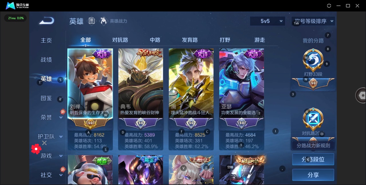 - [11519812]V4 3传说 104英雄 101皮肤 可修改实名 传说皮:幻光神枪 限定皮:愿照·九州拓(澜年限),逐霄战戟,鸣野蒿 史诗皮:茶境仙,龙之律动,石田雨龙,星界战将,蔬乡物语(鲁班七号),偶像歌手,乱世虎臣,水果甜心,心灵骇客,功夫厨神,暗隐猎兽者,鬼剑武藏,乐园奇幻夜,缤纷独角兽,水晶猎龙者,曙光守护者,圣诞狂欢,鹰眼统帅