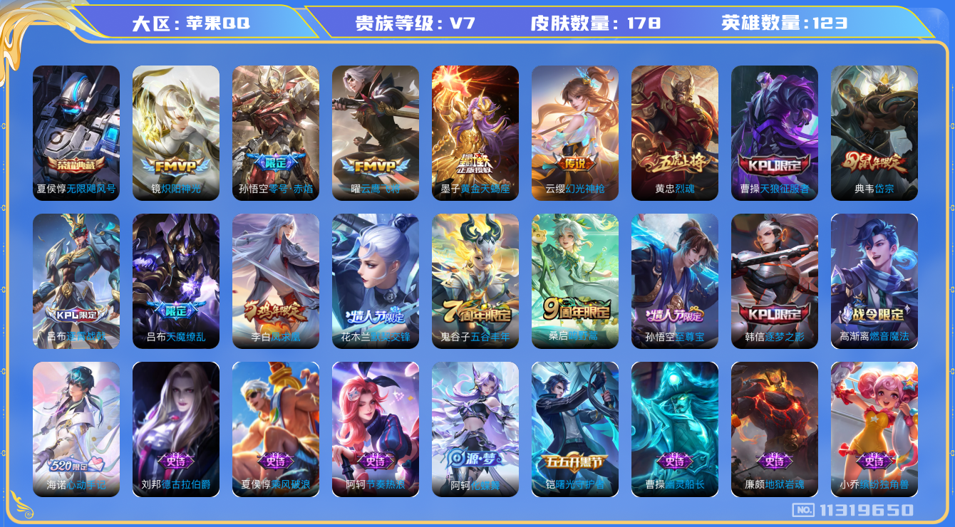 - [12174114]V7 1典藏 9传说 124英雄 258皮肤 可修改实名 优质装备:鸣剑·曳影,黄金狮子座,黄金射手座,绛天战甲(鸡嘴战神),末日机甲-孙尚香(绿蚂蚱),地狱火,仲夏夜之梦(大飞蛾),零号·赤焰,地狱之眼,澜逐花归海,涂山容容 珍宝阁皮:优雅恋人,玩趣恶龙 限定皮:至尊宝,傲雪梅枪,高山流水,五谷丰年,青龙志(铠年限),梁祝,天狼狩猎者,虎魄,李小龙,逐梦之影,孙行者,美猴王 史诗皮:龙之律动,石田雨龙,电玩小子(小书包),白龙吟,黄金分割率,特工魅影,千年之狐,冰冠公主,江河有灵,百解令(蒙犽),高渐离燃音魔法,暗夜猫娘,末日机甲-吕布,猫狗日记-孙策,乱世虎臣,女仆咖啡,摇滚巨星,水果甜心,绅士熊喵,天才门将,心灵骇客,功夫厨神,德古拉伯爵,暗隐猎兽者,幽灵船长,鬼剑武藏,心灵战警,舞动绿茵,诗语江南,纤云弄巧,拒霜思,缤纷独角兽,乘风破浪,逐浪之夏,水晶猎龙者,曙光守护者,金属风暴,圣诞狂欢,鹰眼统帅,魅力维加斯,未来纪元-赵云