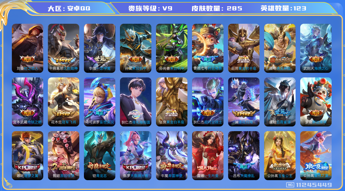[11245449]V9 23传说 123英雄 285皮肤 典藏英雄武则天 可修改实名 优质装备:黄金射手座,冠军飞将,黄金白羊座,久胜战神,一念神魔,云霓雀翎,末日机甲-孙尚香(绿蚂蚱),海洋之心,地狱之眼,胖达荣荣,时之恋人-刘备(电焊工),超时空战士-狄仁杰,末日机甲-孙策,妄想实况,遇见神鼓,鲁班七号-时之奇旅,夜礼服假面,澜逐花归海 限定皮:鸣野蒿,至尊宝,白虎志(电光耗子),凤求凰(白切鸡),凤凰于飞,梅西,青龙志(铠年限),游园惊梦,逐梦之翼,天狼溯光者,逐梦之音,奔雷神使(牛魔年限),天狼绘梦者,逐梦之影,一生所爱,大圣娶亲,引擎之心,天魔缭乱,青春决赛季,蜜橘之夏,美猴王,玉兔公主 史诗皮:芈月浮光幕影,遇见神鹿,紫霞仙子,白龙吟,黄金分割率,特工魅影,千年之狐,末日机甲-莱西奥,匿光侦查者,闲日渔趣,雪夜绮愿(周瑜),百解令(蒙犽),白蛇,魅语,无限星赏官,冰冠公主,末日机甲-吕布,猫狗日记-孙策,猫狗日记-大乔,时之恋人-孙尚香,乱世虎臣,节奏热浪,修罗,女仆咖啡,摇滚巨星,水果甜心,绅士熊喵,天才门将,星夜王子,心灵骇客,功夫厨神,德古拉伯爵,暗隐猎兽者,幽灵船长,鬼剑武藏,暗渊魔法,心灵战警,乐园奇幻夜,天秀·启明,舞动绿茵,地狱岩魂,缤纷独角兽,乘风破浪,逐浪之夏,龙鼓争鸣,月团寄思,水晶猎龙者,曙光守护者,热力回旋,箭羽风息,金属风暴,圣诞狂欢,圣诞恋歌,鹰眼统帅,暗夜贵公子,魅力维加斯,雪上飞焰,奇遇舞章,未来纪元-赵云