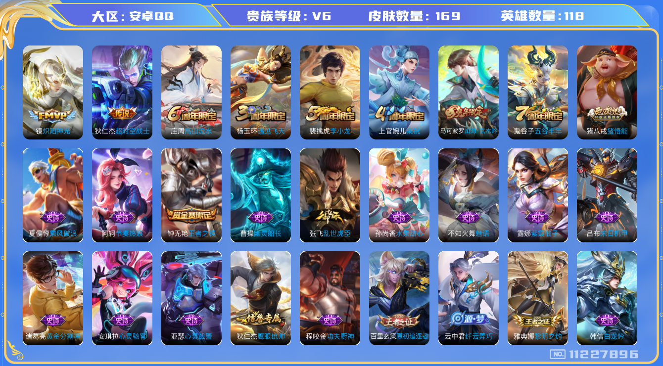 [11227896]V6 2传说 118英雄 169皮肤 可修改实名 传说皮:炽阳神光,超时空战士-狄仁杰 珍宝阁皮:女武神 限定皮:遇见飞天,高山流水,五谷丰年,梁祝,李小龙,猪悟能,山海·玄木吟(马可年限) 史诗皮:紫霞仙子,白龙吟,黄金分割率,魅语,龙骑士(小龙虾),末日机甲-吕布,乱世虎臣,节奏热浪,水果甜心,心灵骇客,功夫厨神,幽灵船长,心灵战警,纤云弄巧,繁星吟游(呼啦呼啦),乘风破浪,逐浪之夏,金属风暴,原初追逐者,鹰眼统帅,王者之锤,黎明之约
