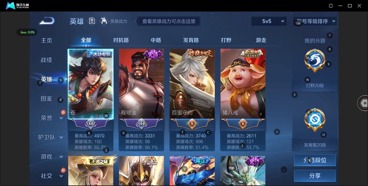 - PX_2112150-贵族等级: V4 英雄数: 122 皮肤数: 109 传说皮: 澜逐花归海,幻光神枪 限定皮: 李小龙,鸣野蒿,愿照·九州拓