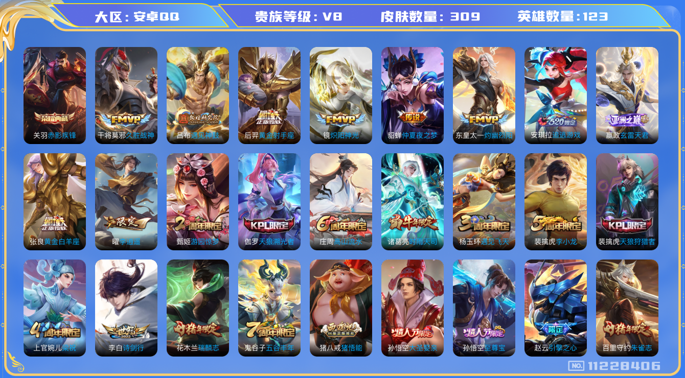 - [12090302]V8 2无双 1珍品传说 24传说 123英雄 255皮肤 可修改实名 优质装备:碎月剑心(李白无双),小乔时之魔女(小乔无双),怪盗基德,冠军飞将,云鹰飞将(小将军),绛天战甲(鸡嘴战神),黄金白羊座,一念神魔,云霓雀翎,末日机甲-孙尚香(绿蚂蚱),音你心动-小乔,飞鸢探春,音你心动-周瑜,乞巧织情,时之恋人-刘备(电焊工),游龙清影(小青龙),淬星耀世,碎云,惊梅引,遇见神鼓,琥珀纪元铠,琥珀纪元马超 传说皮:典韦战鼓燎原,幻光神枪 珍宝阁皮:玩趣恶龙 限定皮:逐霄战戟,鸣野蒿,玄嵩(庄周年限),匿光决锋者,怒海麟威,五谷丰年,幽恒(沐浴露),烈魂,岱宗(典韦年限),辉光之辰,奇迹圣诞,孙行者,猪悟能 史诗皮:器灵·浮梦炉,化蝶舞,龙之律动,琥珀纪元伽罗,蔬乡物语(鲁班七号),百相守梦-黄忠,织梦人,紫霞仙子,千年之狐,末日机甲-莱西奥,魅语,百解令(蒙犽),青蛇,偶像歌手,白蛇,末日机甲-吕布,猫狗日记-孙策,乱世虎臣,节奏热浪,女仆咖啡,摇滚巨星,水果甜心,天才门将,星夜王子,心灵骇客,德古拉伯爵,暗隐猎兽者,幽灵船长,鬼剑武藏,舞动绿茵,纤云弄巧,拒霜思,缤纷独角兽,乘风破浪,箭羽风息,金属风暴,圣诞狂欢,圣诞恋歌,鹰眼统帅,魅力维加斯