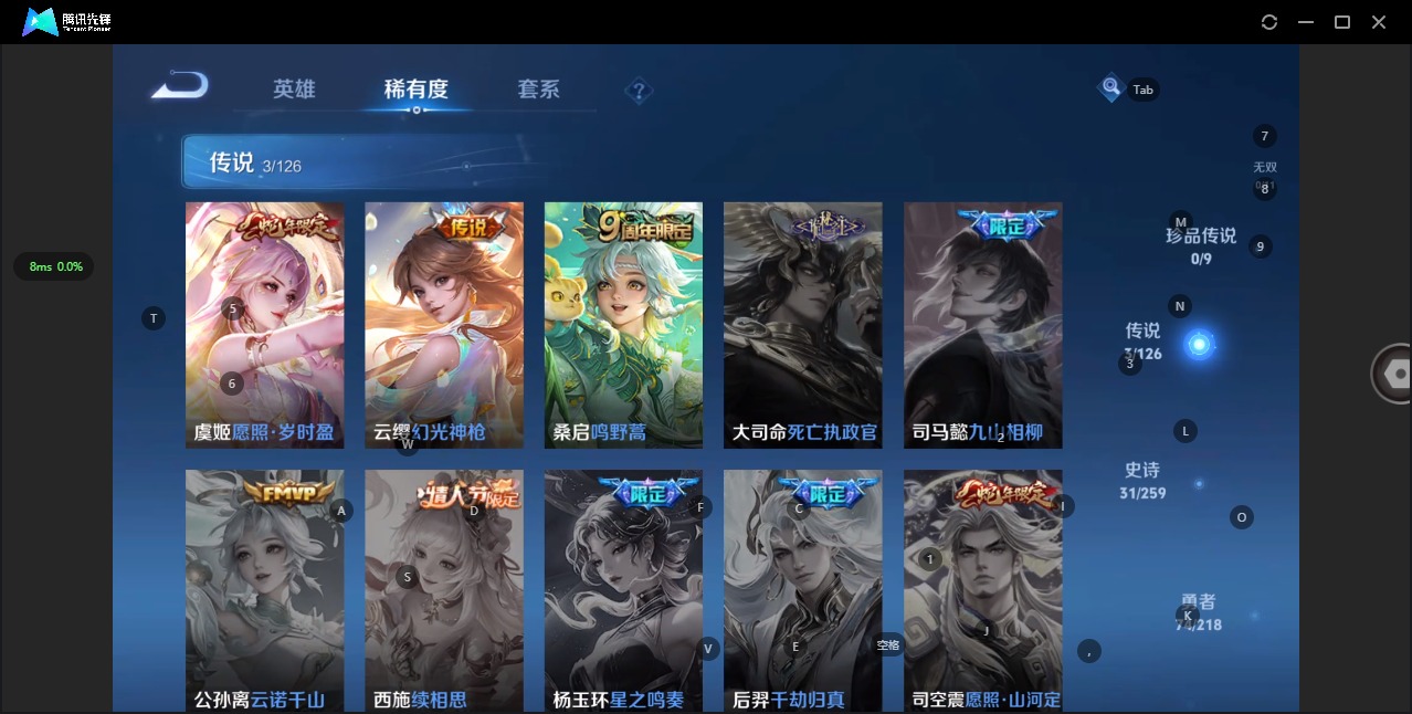 - [11578998]V7 6传说 123英雄 279皮肤 可修改实名 传说皮:山海·炽霜斩(李信年限),地狱火,胖达荣荣,末日机甲-孙策,碎云 珍宝阁皮:万物之道,优雅恋人,女武神 限定皮:鸣野蒿,傲雪梅枪,遇见飞天,高山流水,五谷丰年,游园惊梦,梁祝,奔雷神使(牛魔年限),李小龙,如梦令-后羿 史诗皮:紫霞仙子,特工魅影,江河有灵,蒙恬荣光圣徽,冰冠公主,末日机甲-吕布,猫狗日记-孙策,猫狗日记-大乔,乱世虎臣,节奏热浪,女仆咖啡,摇滚巨星,水果甜心,绅士熊喵,天才门将,星夜王子,心灵骇客,功夫厨神,德古拉伯爵,暗隐猎兽者,幽灵船长,鬼剑武藏,心灵战警,乐园奇幻夜,舞动绿茵,地狱岩魂,纤云弄巧,繁星吟游(呼啦呼啦),拒霜思,缤纷独角兽,乘风破浪,逐浪之夏,水晶猎龙者,曙光守护者,金属风暴,原初追逐者,圣诞狂欢,圣诞恋歌,鹰眼统帅,王者之锤,魅力维加斯,黎明之约,无心,未来纪元-赵云