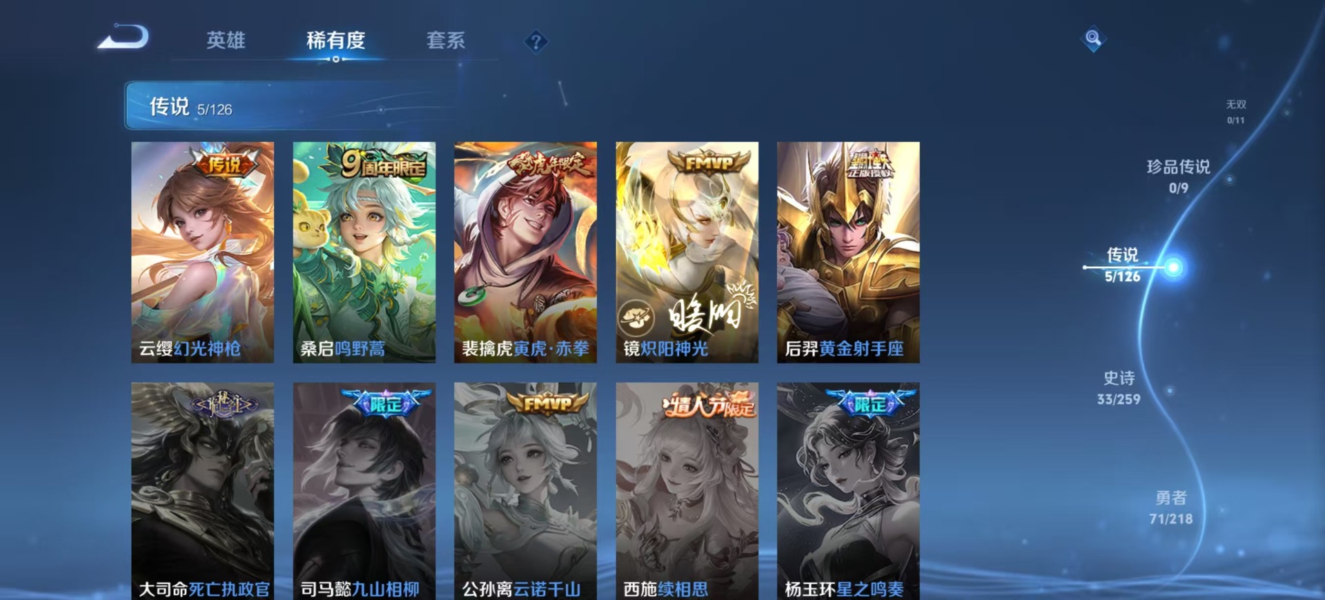 - [11631244]V10 5典藏 10无双 4珍品传说 73传说 126英雄 540皮肤 典藏英雄武则天 可修改实名 优质装备:倪克斯神谕(宇宙婆娘),鸣剑·曳影,幻阙歌(貂蝉典藏),真我赫兹(瑶)(瑶无双),神器·明辉仪,青丘·九尾(妲己无双),碎月剑心(李白无双),神鉴启示录,小乔时之魔女(小乔无双),韩信群星魔术团(韩信无双),花合斗,离恨烟(公孙离无双),拾光映像(瑶典藏),雪境奇遇-甄姬,器灵·螭龙剑,器灵·落星盏,酷洛米之心,大耳狗之梦,黄金射手座,云鹰飞将(小将军),黄金白羊座,猫影幻舞,炽阳神光,云霓雀翎,李逍遥,游龙清影(小青龙),淬星耀世,挚爱之约,挚爱花嫁,天秀幻梦,神器·明辉仪,山海·炽霜斩(李信年限),山海·琳琅生(小乔年限),山海·苍雷引(电光曜子),燃星之曲,画中仙,浮生妄,青丘·九尾,百相守梦(张飞),追逃游戏(亚瑟),追逃游戏(安琪拉),鹤羽星尊,灼幽烈阳,鹤归松栖(云缨),遇见神鼓,鲁班七号-时之奇旅,大乔-时之奇旅,永恒水手月亮,夜礼服假面,霜月吟,澜逐花归海,艾琳觅芳踪,琥珀纪元铠,琥珀纪元马超,金乌负日,黄金天蝎座,云中君群星魔术团,朵莉亚心动手记,千劫归真,涂山容容 珍品传说:时之奇旅-孙策 传说皮:乘龙·问璇玑(孙尚香年限),乘龙·铭钟鼎(赵云年限),乘龙·淬吴钩(孙策年限),貂蝉曦玄引,吕布曦玄引,落雪白狼,续相思,星之鸣奏,祥瑞亨通,幻光神枪 珍宝阁皮:万物之道,女武神,玩趣恶龙 限定皮:愿照·九州拓(澜年限),愿照·福禄聚(蔡文姬年限),愿照·岁时盈(虞姬年限),愿照·山河定(司空震年限),愿照·众生和(妲己年限),愿照·千秋盛(女娲年限),逐霄战戟,映山客,陌上桑,鸣野蒿,夏侯惇霜北刀,凤凰于飞,太华(伽罗年限),异界灵契(白毛香),补天,寅虎·展翼(孙膑年限),前尘镜,星穹之声,绯月行,白鹤梁神女,魔法小厨娘,白晶晶,时雨天司(水龙头),飞衡(韩信年限),玄嵩(庄周年限),山海·碧波行(瑶年限),无限倾心-项羽,至美·乘鲤谣,至美·化雀舞,遇见飞天,无限倾心-虞姬,降魔,五谷丰年,幽恒(沐浴露),游园惊梦,御风骁将(吕布年限),逐梦之翼,岱宗(典韦年限),虎魄,逐梦之音,奔雷神使(牛魔年限),祈雪灵祝(雪兔子),如梦令-嫦娥,如梦令-后羿,默契交锋-兰陵王,默契交锋-花木兰,一生所爱,大圣娶亲,云端筑梦师,蜜橘之夏,神奇女侠