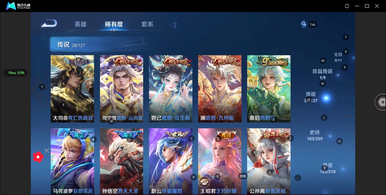 - [11524675]V5 4传说 104英雄 104皮肤 可修改实名 传说皮:典韦战鼓燎原,幻光神枪 珍宝阁皮:女武神 限定皮:愿照·九州拓(澜年限),逐霄战戟,鸣野蒿,李小龙 史诗皮:化蝶舞,破空之剑,蔬乡物语(鲁班七号),琥珀纪元伽罗,紫霞仙子,千年之狐,江河有灵,青蛇,猫狗日记-大乔,乱世虎臣,节奏热浪,摇滚巨星,水果甜心,天才门将,幽灵船长,鬼剑武藏,纤云弄巧,拒霜思,缤纷独角兽,逐浪之夏,圣诞恋歌,鹰眼统帅,雪上飞焰,未来纪元-赵云
