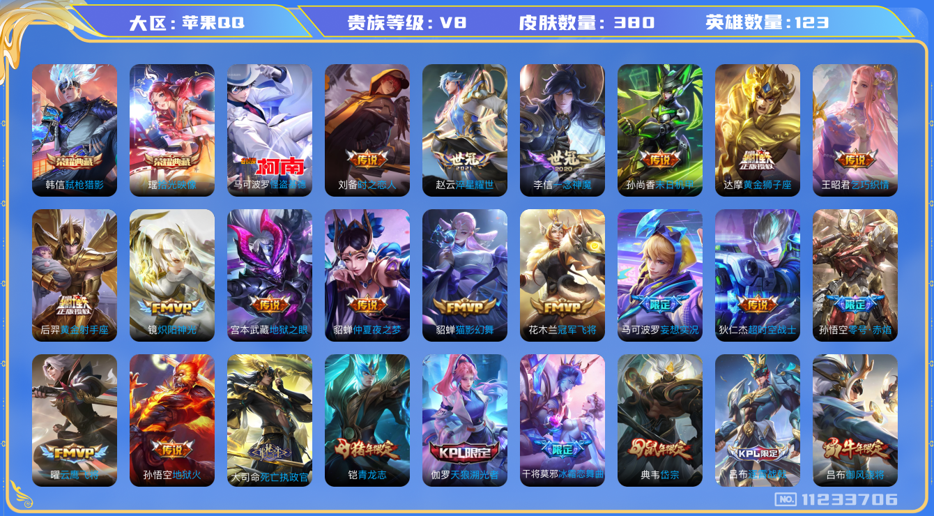 [11233706]V8 2典藏 1珍品传说 28传说 123英雄 380皮肤 可修改实名 优质装备:弑枪猎影(韩信典藏),拾光映像(瑶典藏),怪盗基德,黄金狮子座,黄金射手座,冠军飞将,云鹰飞将(小将军),猫影幻舞,炽阳神光,一念神魔,末日机甲-孙尚香(绿蚂蚱),地狱火,仲夏夜之梦(大飞蛾),零号·赤焰,地狱之眼,乞巧织情,时之恋人-刘备(电焊工),淬星耀世,超时空战士-狄仁杰,妄想实况 传说皮:死亡执政官 珍宝阁皮:蔷薇恋人,玩趣恶龙 限定皮:愿照·九州拓(澜年限),愿照·山河定(司空震年限),愿照·众生和(妲己年限),逐霄战戟,鸣野蒿,至尊宝,白虎志(电光耗子),傲雪梅枪,白晶晶,时雨天司(水龙头),神威(电光马子),飞衡(韩信年限),高山流水,齐天大圣,五谷丰年,青龙志(铠年限),冰锋战神,武圣,梁祝,御风骁将(吕布年限),岱宗(典韦年限),天狼溯光者,祈雪灵祝(雪兔子),李小龙,逐梦之影,朱雀志(守约年限),默契交锋-花木兰,孙行者,猪悟能,引擎之心,冰霜恋舞曲 史诗皮:鸭鸭历险记-刘禅,器灵·浮梦炉,化蝶舞,星界特工,龙之律动,茶境仙,破空之剑,怒海争锋,谪仙醉月,蔬乡物语(鲁班七号),百相守梦-百里守约,百相守梦-黄忠,紫霞仙子,苍穹之光,白龙吟,特工魅影,千年之狐,江河有灵,偶像歌手,龙骑士(小龙虾),魅语,晚萤,冰冠公主,末日机甲-吕布,猫狗日记-孙策,猫狗日记-大乔,时之恋人-孙尚香,乱世虎臣,节奏热浪,修罗,女仆咖啡,摇滚巨星,水果甜心,绅士熊喵,星夜王子,心灵骇客,时之奇旅-安琪拉,功夫厨神,德古拉伯爵,暗隐猎兽者,幽灵船长,鬼剑武藏,暗渊魔法,心灵战警,乐园奇幻夜,天秀·启明,舞动绿茵,地狱岩魂,纤云弄巧,拒霜思,缤纷独角兽,乘风破浪,水晶猎龙者,曙光守护者,热力回旋,金属风暴,鹰眼统帅,魅力维加斯,黎明之约,雪上飞焰,赏金猎手,无心,未来纪元-赵云