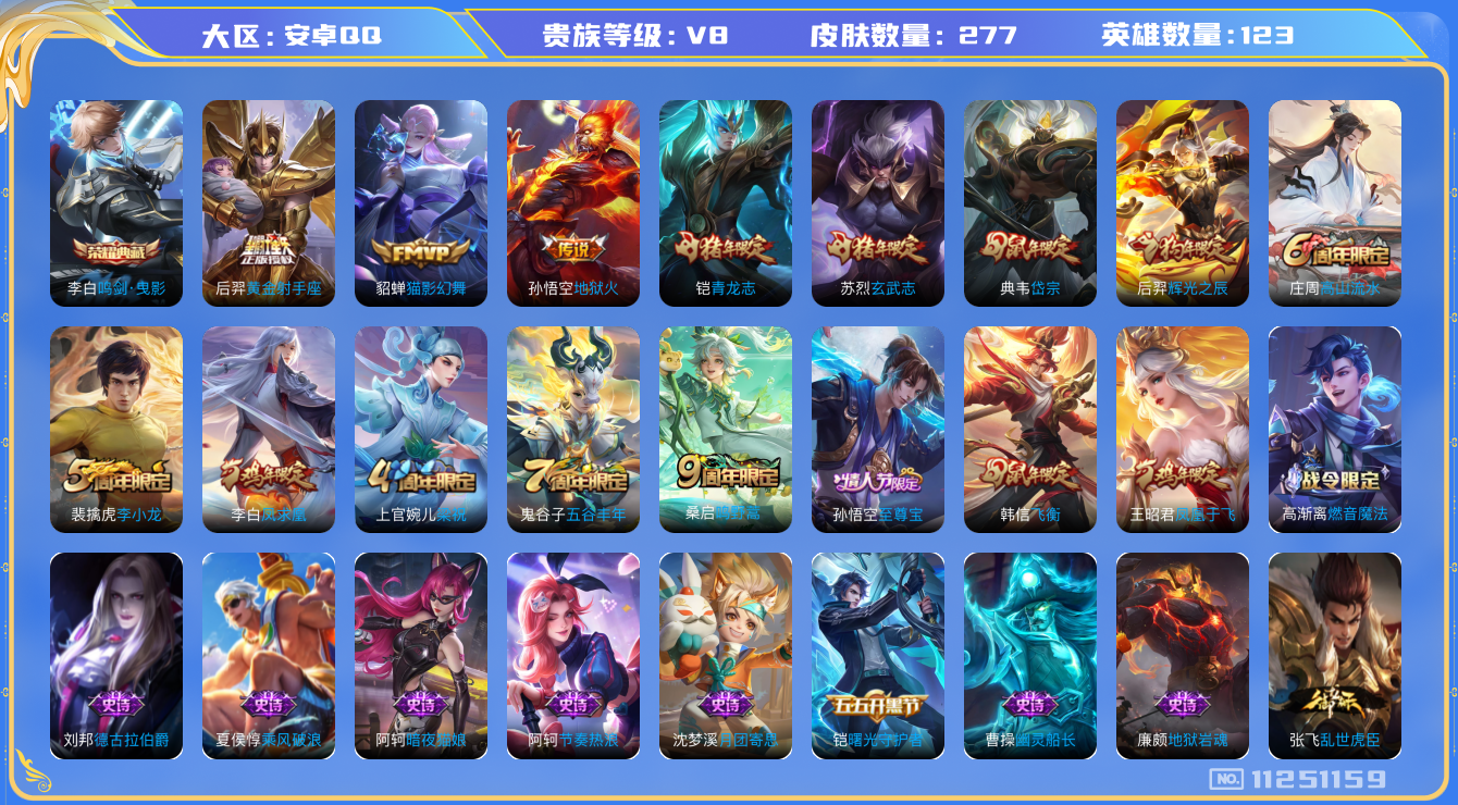 [11251159]V8 1典藏 6传说 123英雄 277皮肤 可修改实名 优质装备:鸣剑·曳影,黄金射手座,猫影幻舞,地狱火 珍宝阁皮:蔷薇恋人,女武神 限定皮:鸣野蒿,至尊宝,凤求凰(白切鸡),凤凰于飞,飞衡(韩信年限),高山流水,五谷丰年,青龙志(铠年限),梁祝,岱宗(典韦年限),李小龙,玄武志(苏烈年限),辉光之辰 史诗皮:龙之律动,蔬乡物语(鲁班七号),琥珀纪元伽罗,紫霞仙子,苍穹之光,白龙吟,特工魅影,千年之狐,永昼,电玩·爆裂旋风,真我赫兹(百里守约),匿光侦查者,江河有灵,雪夜绮愿(周瑜),百解令(蒙犽),高渐离燃音魔法,龙骑士(小龙虾),暗夜猫娘,无限星赏官,猫狗日记-孙策,时之恋人-孙尚香,乱世虎臣,节奏热浪,女仆咖啡,水果甜心,绅士熊喵,星夜王子,心灵骇客,功夫厨神,德古拉伯爵,暗隐猎兽者,幽灵船长,鬼剑武藏,心灵战警,舞动绿茵,地狱岩魂,纤云弄巧,繁星吟游(呼啦呼啦),拒霜思,缤纷独角兽,乘风破浪,逐浪之夏,月团寄思,水晶猎龙者,曙光守护者,唤灵魅影,金属风暴,圣诞狂欢,圣诞恋歌,鹰眼统帅,魅力维加斯,未来纪元-赵云,玫瑰异探