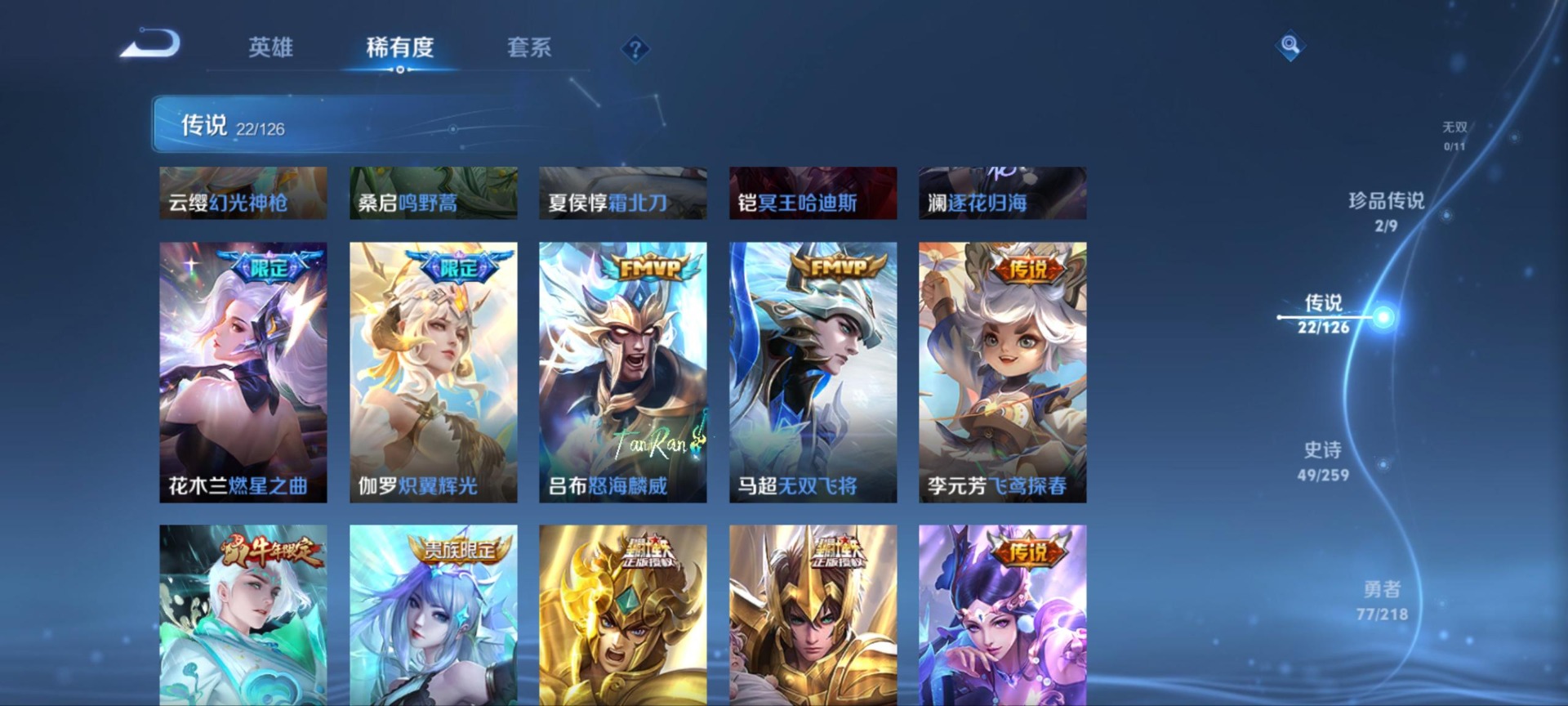 - PX_2103180-Q/至尊星耀/317皮肤/123英雄/2典藏/0珍品无双/0无双/1珍品传说/26传说/93史诗/8稀有英雄 【1 珍品传说】时之奇旅 孙策, 【2 典藏皮肤】全息碎影 孙悟空,弑枪猎影 韩信, 【26 传说皮肤】永恒水手月亮 王昭君,启明星使 虞姬,碎云 百里守约,逐花归海 澜,李逍遥 曜,零号·赤焰 孙悟空,云鹰飞将 曜,齐天大圣 孙悟空,夜礼服假面 狄仁杰,游龙清影