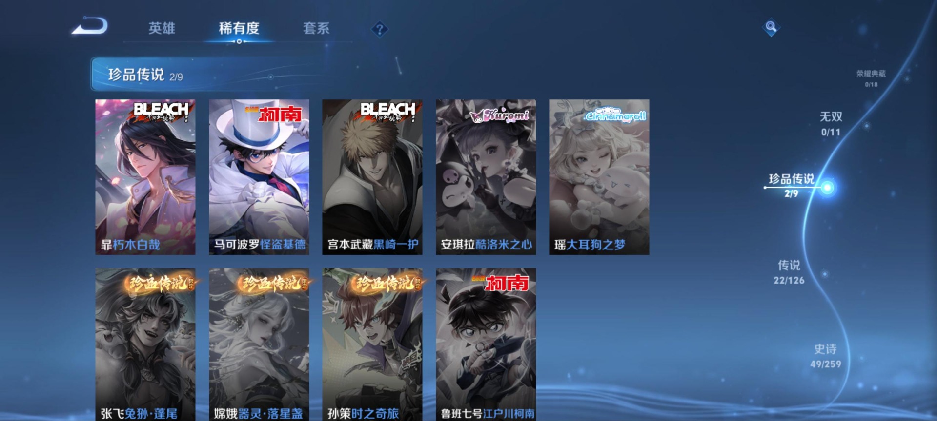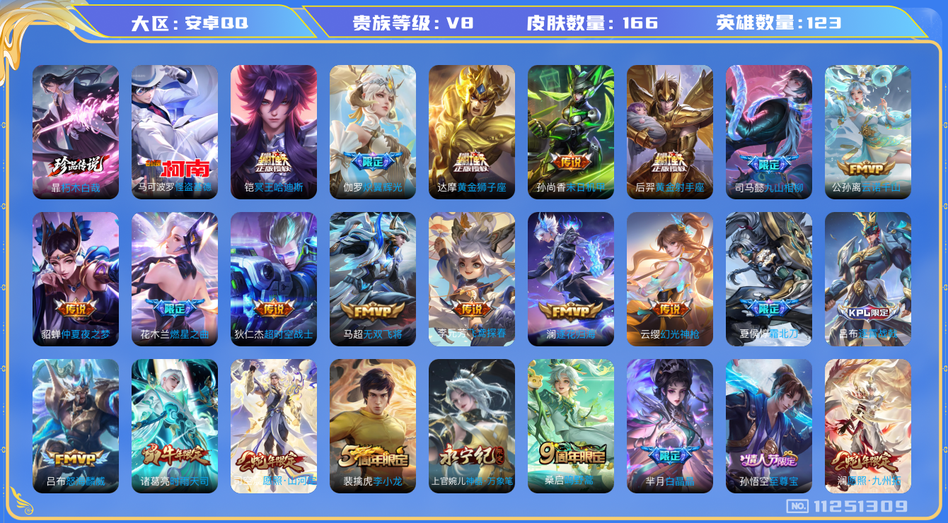 [11251309]V8 2珍品传说 22传说 123英雄 166皮肤 可修改实名 优质装备:怪盗基德,朽木白哉,黄金狮子座,黄金射手座,末日机甲-孙尚香(绿蚂蚱),仲夏夜之梦(大飞蛾),飞鸢探春,超时空战士-狄仁杰,无双飞将,炽翼辉光(娃娃菜牛角包),燃星之曲,澜逐花归海 传说皮:九山相柳,云诺千山,幻光神枪,铠冥王哈迪斯 珍宝阁皮:蔷薇恋人 限定皮:愿照·九州拓(澜年限),愿照·岁时盈(虞姬年限),愿照·山河定(司空震年限),逐霄战戟,鸣野蒿,夏侯惇霜北刀,至尊宝,白晶晶,时雨天司(水龙头),怒海麟威,李小龙,神器·万象笔 史诗皮:鸭鸭历险记-刘禅,器灵·浮梦炉,狼魂孤将,化蝶舞,龙之律动,雪豹·霜爪,藏狐·褐绒,破空之剑,蒙犽顽岩魄,谪仙醉月,百相守梦-黄忠,特工魅影,千年之狐,百相守梦(刘备),偶像歌手,末日机甲-吕布,猫狗日记-孙策,修罗,女仆咖啡,水果甜心,星夜王子,心灵骇客,功夫厨神,暗隐猎兽者,幽灵船长,鬼剑武藏,心灵战警,舞动绿茵,地狱岩魂,拒霜思,乘风破浪,逐浪之夏,水晶猎龙者,金属风暴,原初追逐者,圣诞狂欢,圣诞恋歌,鹰眼统帅,魅力维加斯