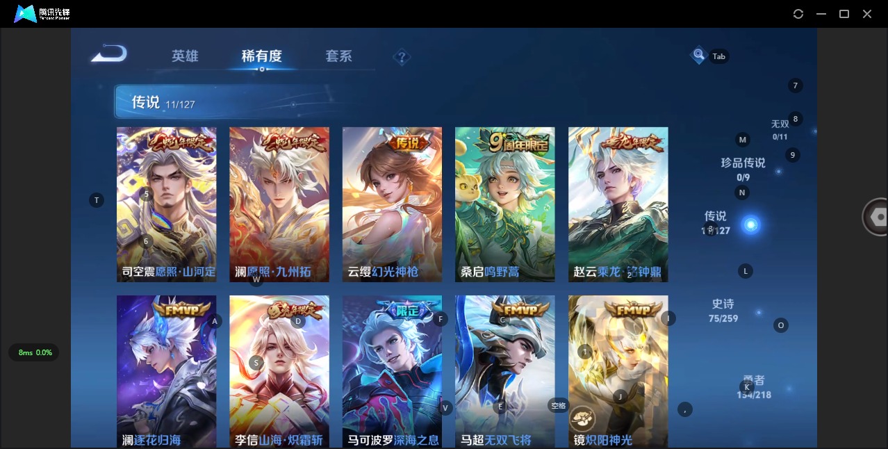 - [12026855]V8 1典藏 1珍品传说 16传说 125英雄 299皮肤 可修改实名 优质装备:赤影疾锋,怪盗基德,久胜战神,一念神魔,末日机甲-孙尚香(绿蚂蚱),仲夏夜之梦(大飞蛾),时之恋人-刘备(电焊工),淬星耀世,末日机甲-孙策,无双飞将,山海·炽霜斩(李信年限),画中仙 传说皮:续相思,幻光神枪 珍宝阁皮:蔷薇恋人,女武神 限定皮:愿照·山河定(司空震年限),逐霄战戟,鸣野蒿,白虎志(电光耗子),五谷丰年,游园惊梦,李小龙,逐梦之影,猪悟能,一生所爱,大圣娶亲,神器·万象笔,山海·玄木吟(马可年限) 史诗皮:鸭鸭历险记-刘禅,绮世丹青,化蝶舞,星界战将,谪仙醉月,龙之律动,石田雨龙,茶境仙,怒海争锋,破空之剑,战舞者,蒙犽顽岩魄,蔬乡物语(鲁班七号),百相守梦-百里守约,星界特工,紫霞仙子,苍穹之光,电玩小子(小书包),白龙吟,黄金分割率,特工魅影,千年之狐,江河有灵,魅语,百解令(蒙犽),高渐离燃音魔法,蒙恬荣光圣徽,无限星赏官,冰冠公主,偶像歌手,龙骑士(小龙虾),末日机甲-吕布,猫狗日记-孙策,乱世虎臣,节奏热浪,修罗,女仆咖啡,摇滚巨星,水果甜心,天才门将,星夜王子,心灵骇客,功夫厨神,德古拉伯爵,暗隐猎兽者,幽灵船长,鬼剑武藏,心灵战警,天秀·启明,舞动绿茵,地狱岩魂,纤云弄巧,缤纷独角兽,乘风破浪,逐浪之夏,月团寄思,水晶猎龙者,曙光守护者,箭羽风息,唤灵魅影,金属风暴,原初追逐者,圣诞狂欢,圣诞恋歌,鹰眼统帅,魅力维加斯,无心,未来纪元-赵云
