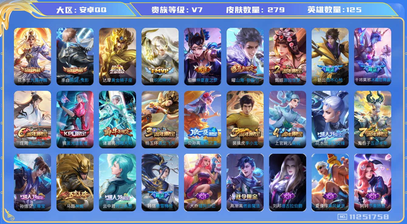 [11251758]V7 2典藏 5传说 125英雄 279皮肤 可修改实名 女号 荣耀水晶:鸣剑·曳影,九霄神辉(木兰典藏) 传说皮:黄金狮子座,仲夏夜之梦(大飞蛾),炽阳神光,山海·苍雷引(电光曜子) 珍宝阁皮:万物之道,优雅恋人,蔷薇恋人 限定皮:至尊宝,傲雪梅枪,时雨天司(水龙头),神威(电光马子),遇见飞天,高山流水,五谷丰年,游园惊梦,梁祝,李小龙,默契交锋-花木兰,冰霜恋舞曲,蜜橘之夏,匿光追影者,时之祈愿-云中君,百木心枪 史诗皮:蒙犽顽岩魄,破空之剑,紫霞仙子,电玩小子(小书包),黄金分割率,特工魅影,千年之狐,永昼,江河有灵,高渐离燃音魔法,百解令(蒙犽),蒙恬荣光圣徽,冰冠公主,偶像歌手,晚萤,魅语,电玩·爆裂旋风,末日机甲-吕布,猫狗日记-孙策,猫狗日记-大乔,时之恋人-孙尚香,乱世虎臣,节奏热浪,修罗,女仆咖啡,摇滚巨星,水果甜心,天才门将,星夜王子,心灵骇客,功夫厨神,德古拉伯爵,暗隐猎兽者,幽灵船长,鬼剑武藏,暗渊魔法,心灵战警,舞动绿茵,地狱岩魂,纤云弄巧,繁星吟游(呼啦呼啦),拒霜思,缤纷独角兽,乘风破浪,逐浪之夏,水晶猎龙者,曙光守护者,箭羽风息,金属风暴,原初追逐者,圣诞狂欢,圣诞恋歌,鹰眼统帅,魅力维加斯,黎明之约,赏金猎手,无心,未来纪元-赵云
