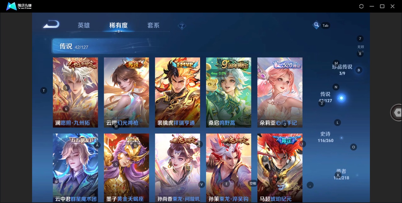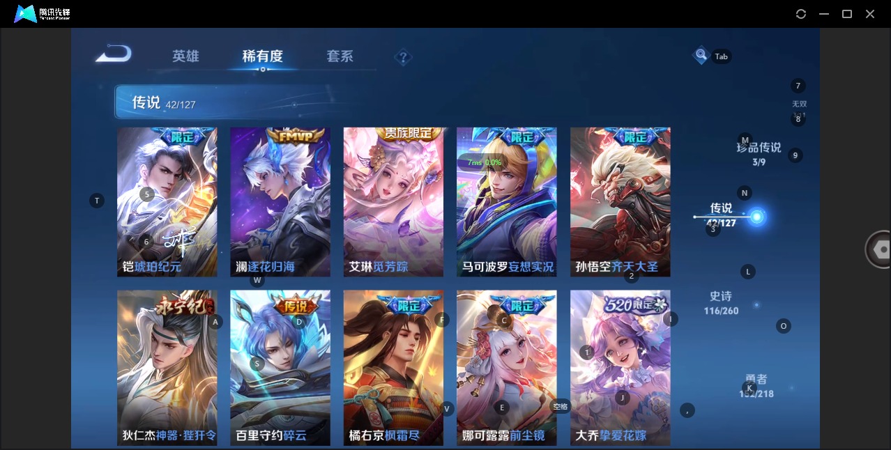 - [11512908]V7 7传说 117英雄 127皮肤 可修改实名 优质装备:黄金狮子座,猫影幻舞,久胜战神,末日机甲-孙尚香(绿蚂蚱),零号·赤焰,淬星耀世 珍宝阁皮:玩趣恶龙 限定皮:至尊宝,遇见飞天,武圣,李小龙,朱雀志(守约年限),猪悟能,大圣娶亲 史诗皮:水果甜心,天才门将,暗隐猎兽者,鬼剑武藏,地狱岩魂,缤纷独角兽,原初追逐者,圣诞恋歌,鹰眼统帅,魅力维加斯,黎明之约,未来纪元-赵云