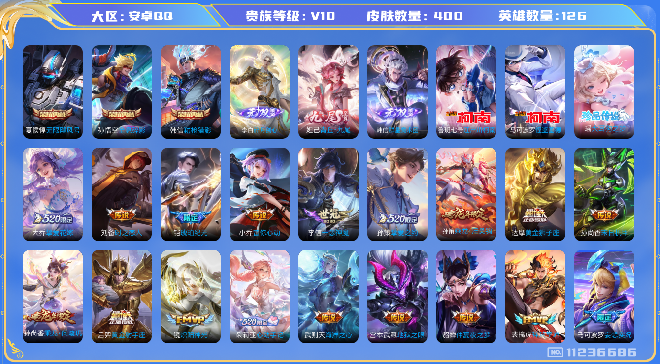 [11236686]V10 3典藏 3无双 3珍品传说 42传说 126英雄 400皮肤 典藏英雄武则天 可修改实名 优质装备:无限飓风号(高达),全息碎影(猴子典藏),弑枪猎影(韩信典藏),青丘·九尾(妲己无双),碎月剑心(李白无双),韩信群星魔术团(韩信无双),江户川柯南,怪盗基德,大耳狗之梦,黄金狮子座,黄金射手座,云鹰飞将(小将军),炽阳神光,一念神魔,云霓雀翎,末日机甲-孙尚香(绿蚂蚱),地狱火,仲夏夜之梦(大飞蛾),音你心动-小乔,零号·赤焰,海洋之心,地狱之眼,时之恋人-刘备(电焊工),超时空战士-狄仁杰,挚爱之约,挚爱花嫁,碎云,神器·狴犴令,青丘·九尾,妄想实况,澜逐花归海,艾琳觅芳踪,琥珀纪元铠,琥珀纪元马超,黄金天蝎座,云中君群星魔术团,朵莉亚心动手记 传说皮:乘龙·问璇玑(孙尚香年限),乘龙·淬吴钩(孙策年限),祥瑞亨通,幻光神枪 珍宝阁皮:万物之道,玩趣恶龙 限定皮:愿照·九州拓(澜年限),逐霄战戟,陌上桑,鸣野蒿,至尊宝,白虎志(电光耗子),凤求凰(白切鸡),梅西,武陵仙君(小桃花),前尘镜,魔法小厨娘,神威(电光马子),遇见飞天,齐天大圣,五谷丰年,青龙志(铠年限),冰锋战神,游园惊梦,逐梦之翼,逐梦之音,天狼绘梦者,李小龙,逐梦之影,玄武志(苏烈年限),朱雀志(守约年限),永曜之星,辉光之辰,霸王别姬-虞姬,默契交锋-花木兰,孙行者,猪悟能,一生所爱,大圣娶亲,引擎之心,天魔缭乱,青春决赛季,冰霜恋舞曲,蜜橘之夏,神奇女侠,枫霜尽 史诗皮:苍鳞隐世,星界战将,灵蛊蚀心,茶境仙,海诺心动手记,破空之剑,芈月浮光幕影,怒海争锋,决胜骁骑,上官婉儿群星魔术团,蔬乡物语(鲁班七号),乘龙·聚宝船(安琪拉年限),琥珀纪元伽罗,炽弈燎原,遇见神鹿,紫霞仙子,苍穹之光,电玩小子(小书包),白龙吟,黄金分割率,特工魅影,千年之狐,江河有灵,偶像歌手,龙骑士(小龙虾),暗夜猫娘,魅语,无限星赏官,晚萤,冰冠公主,末日机甲-吕布,猫狗日记-孙策,猫狗日记-大乔,时之恋人-孙尚香,乱世虎臣,节奏热浪,修罗,女仆咖啡,摇滚巨星,水果甜心,绅士熊喵,天才门将,星夜王子,心灵骇客,功夫厨神,德古拉伯爵,暗隐猎兽者,幽灵船长,鬼剑武藏,心灵战警,舞动绿茵,地狱岩魂,诗语江南,纤云弄巧,繁星吟游(呼啦呼啦),缤纷独角兽,乘风破浪,逐浪之夏,水晶猎龙者,曙光守护者,箭羽风息,唤灵魅