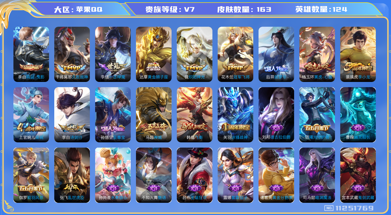 [11251769]V7 1典藏 6传说 124英雄 163皮肤 可修改实名 优质装备:鸣剑·曳影,黄金狮子座,冠军飞将,久胜战神,炽阳神光,一念神魔 珍宝阁皮:蔷薇恋人 限定皮:至尊宝,神威(电光马子),飞衡(韩信年限),诗剑行,冰锋战神,梁祝,李小龙,如梦令-后羿,寅虎·心曲(虎婆) 史诗皮:龙之律动,紫霞仙子,黄金分割率,千年之狐,偶像歌手,魅语,无限星赏官,冰冠公主,乱世虎臣,修罗,摇滚巨星,水果甜心,心灵骇客,德古拉伯爵,幽灵船长,鬼剑武藏,暗渊魔法,心灵战警,纤云弄巧,逐浪之夏,水晶猎龙者,曙光守护者,箭羽风息,原初追逐者,圣诞狂欢,圣诞恋歌,鹰眼统帅,魅力维加斯,黎明之约