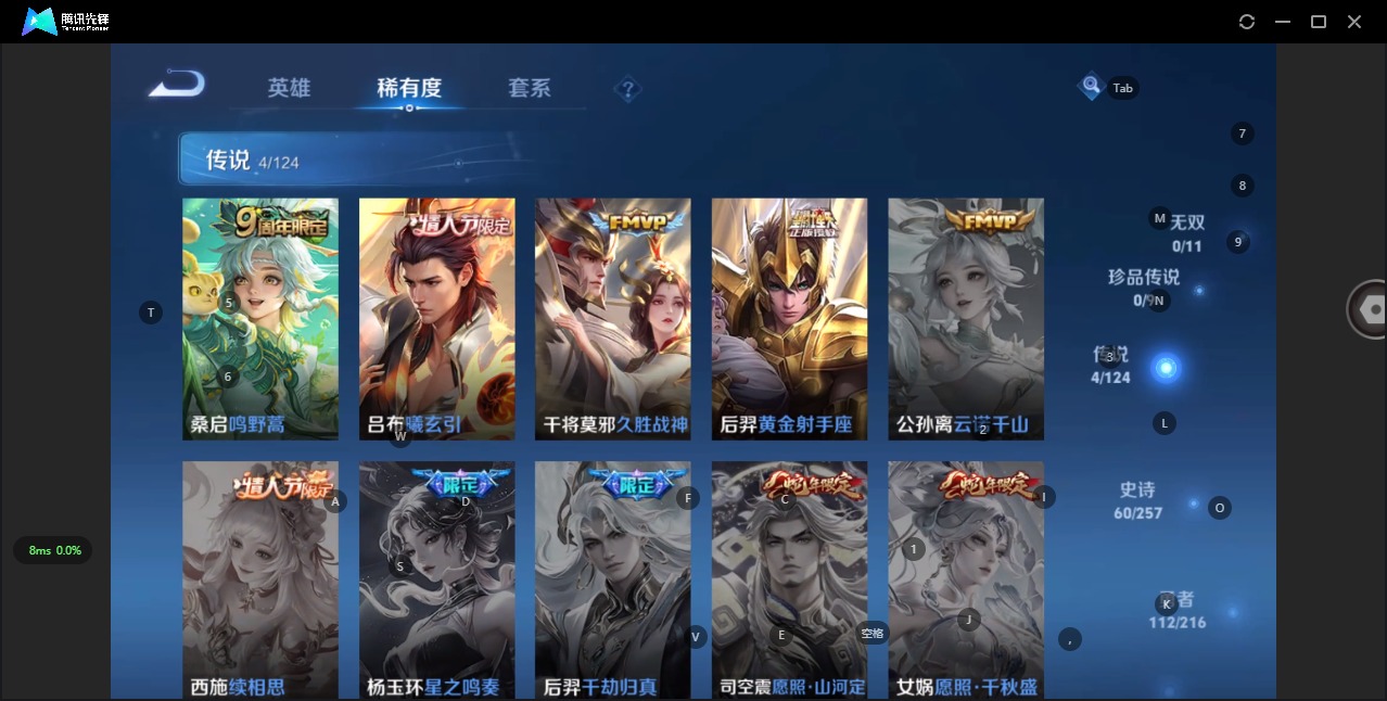 - PX_2095093-实名: 可修改 贵族等级: V7 英雄数: 123 皮肤数: 205 荣耀水晶: 星域神启,银白咏叹调 传说皮: 黄金射手座,绛天战甲,地狱火,地狱之眼,末日机甲-孙策,山海·炽霜斩,电玩·雷克斯 限定皮: 李小龙,游园惊梦,梁祝,神威,飞衡,高山流水,孙行者,五谷丰年,神器·万象笔,山海·玄木吟,冰霜神祇,齐天大圣