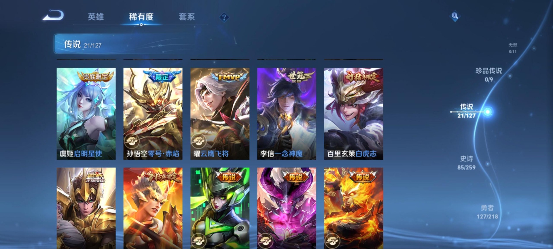 刘邦夺宝奇兵,夏侯惇朔风刀,老夫子醍醐杖,沈梦溪大漠名商,盾山御銮,曹操烛龙,苏烈千军破阵,典韦穷奇,达摩沙漠行僧,牛魔御旌,鲁班七号狮舞东方,吕布猎兽之王,元歌云间偶戏,兰陵王金庭之子,裴擒虎擒涛扼浪,鲁班大师探海日志,明世隐疑决卦,马可波罗暗影游猎,白起狰,鬼谷子原初探秘者,张良古海寻踪,桑启海盐诗旅,狄仁杰万华元夜,嬴政白昼王子,芈月重明,程咬金演武夺筹,扁鹊炼金王,李元芳云中旅人,弈星混沌棋,虞姬凯尔特女王,米莱狄御霄,钟馗神迹守卫,钟馗驱傩正仪,狂铁御狮,太乙真人饕餮