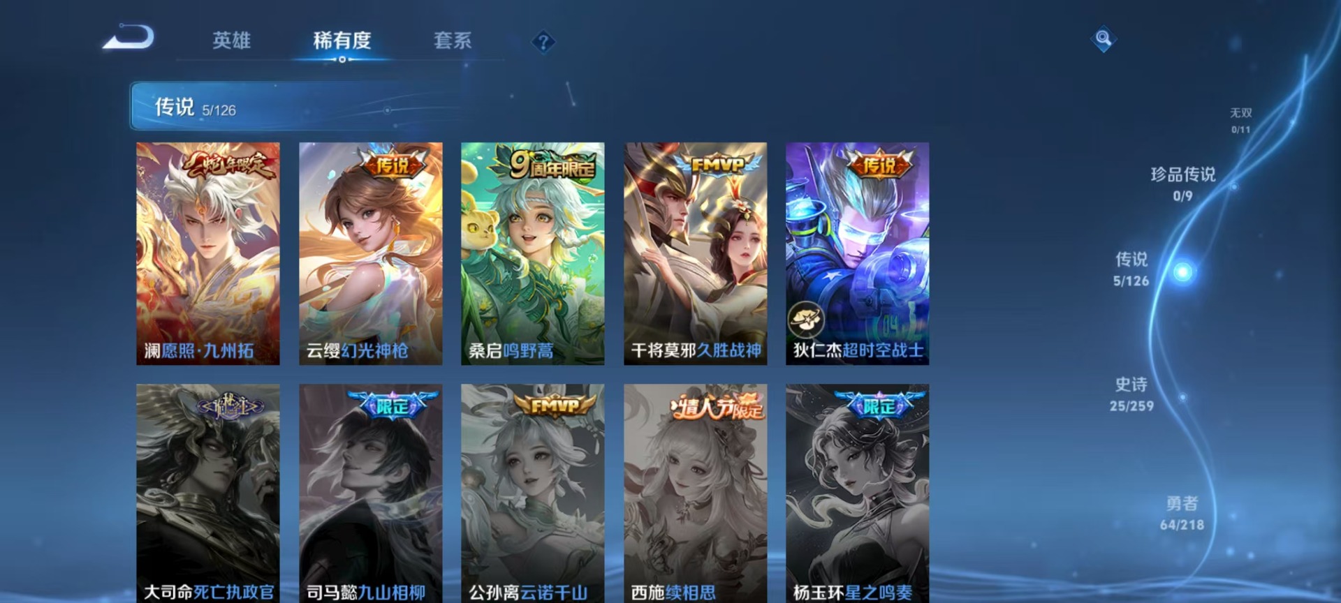 - [11526557]V7 1典藏 1珍品传说 8传说 124英雄 205皮肤 可修改实名 优质装备:弑枪猎影(韩信典藏),器灵·落星盏,猫影幻舞,一念神魔,末日机甲-孙策 传说皮:幻光神枪 珍宝阁皮:优雅恋人,蔷薇恋人,女武神 限定皮:愿照·岁时盈(虞姬年限),逐霄战戟,至尊宝,武陵仙君(小桃花),飞衡(韩信年限),高山流水,诗剑行,怒海麟威,五谷丰年,游园惊梦,岱宗(典韦年限),孙行者,引擎之心 史诗皮:器灵·浮梦炉,化蝶舞,星界战将,龙之律动,茶境仙,百相守梦-百里守约,紫霞仙子,苍穹之光,黄金分割率,特工魅影,江河有灵,蒙恬荣光圣徽,偶像歌手,暗夜猫娘,末日机甲-吕布,猫狗日记-孙策,时之恋人-孙尚香,乱世虎臣,节奏热浪,女仆咖啡,摇滚巨星,水果甜心,绅士熊喵,天才门将,星夜王子,心灵骇客,功夫厨神,德古拉伯爵,暗隐猎兽者,幽灵船长,鬼剑武藏,心灵战警,舞动绿茵,地狱岩魂,纤云弄巧,拒霜思,缤纷独角兽,乘风破浪,逐浪之夏,水晶猎龙者,金属风暴,原初追逐者,圣诞恋歌,鹰眼统帅,魅力维加斯,黎明之约,无心,未来纪元-赵云