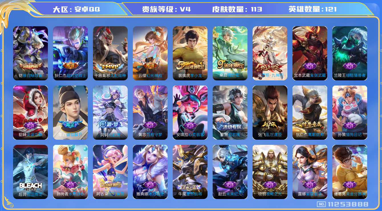 [11253888]V4 1典藏 5传说 121英雄 113皮肤 可修改实名 优质装备:银白咏叹调(倪克斯侍卫),久胜战神,超时空战士-狄仁杰 传说皮:幻光神枪 珍宝阁皮:妄想食味,蔷薇恋人 限定皮:愿照·九州拓(澜年限),鸣野蒿,李小龙 史诗皮:化蝶舞,星界战将,石田雨龙,蒙犽顽岩魄,谪仙醉月,百相守梦-黄忠,紫霞仙子,苍穹之光,黄金分割率,江河有灵,冰冠公主,猫狗日记-孙策,乱世虎臣,水果甜心,绅士熊喵,心灵骇客,暗隐猎兽者,鬼剑武藏,圣诞恋歌,鹰眼统帅,未来纪元-赵云