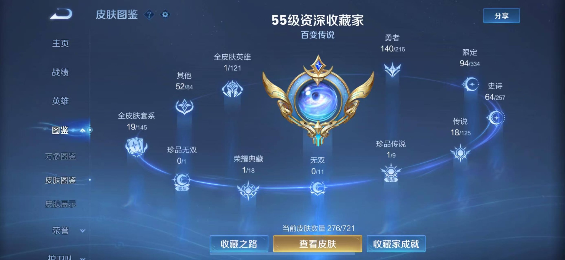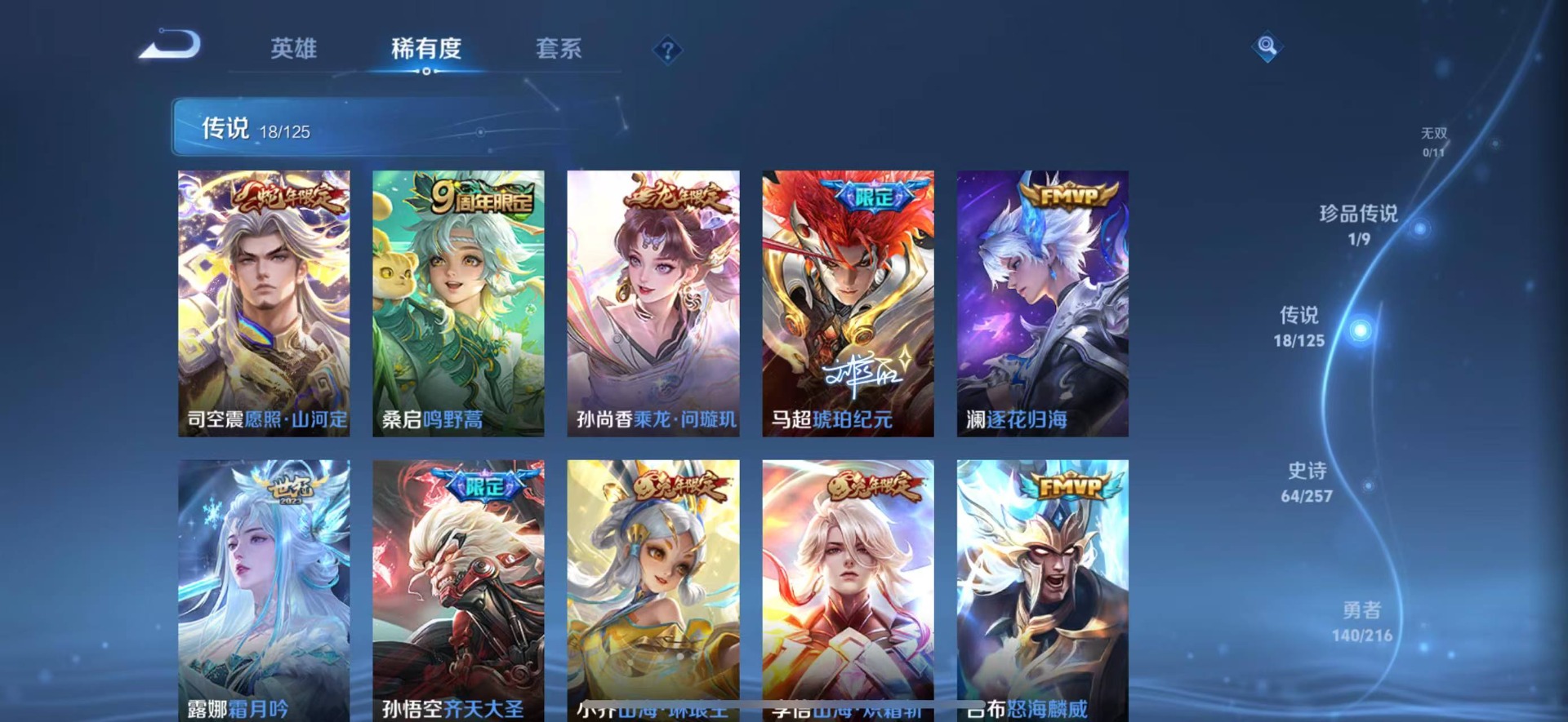 - PX_2057229-贵族等级: V4 英雄数: 97 皮肤数: 64 传说皮: 冠军飞将,时之恋人-刘备,无双飞将,幻光神枪 限定皮: 异界灵契,五谷丰年