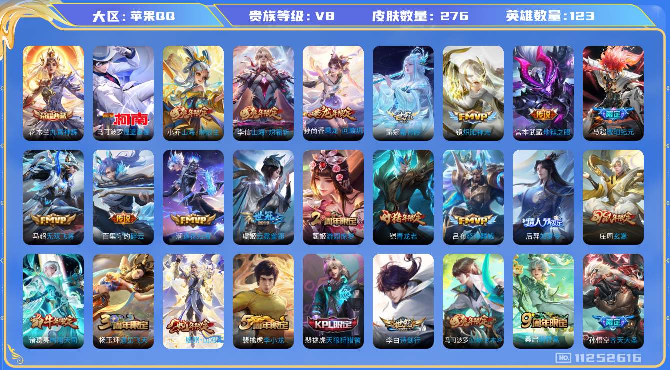 [11252616]V8 1典藏 1珍品传说 18传说 123英雄 276皮肤 可修改实名 优质装备:九霄神辉(木兰典藏),怪盗基德,炽阳神光,云霓雀翎,地狱之眼,无双飞将,碎云,山海·炽霜斩(李信年限),山海·琳琅生(小乔年限),霜月吟,澜逐花归海,琥珀纪元马超 传说皮:乘龙·问璇玑(孙尚香年限) 珍宝阁皮:妄想食味,胡桃夹子 限定皮:愿照·山河定(司空震年限),鸣野蒿,至尊宝,时雨天司(水龙头),神威(电光马子),玄嵩(庄周年限),遇见飞天,诗剑行,齐天大圣,怒海麟威,青龙志(铠年限),游园惊梦,天狼狩猎者,李小龙,如梦令-后羿,霸王别姬-虞姬,孙行者,大圣娶亲,引擎之心,美猴王,山海·玄木吟(马可年限) 史诗皮:百相守梦-黄忠,琥珀纪元伽罗,化蝶舞,紫霞仙子,电玩小子(小书包),黄金分割率,特工魅影,高渐离燃音魔法,百解令(蒙犽),蒙恬荣光圣徽,偶像歌手,晚萤,魅语,暗夜猫娘,猫狗日记-孙策,节奏热浪,水果甜心,绅士熊喵,天才门将,星夜王子,功夫厨神,德古拉伯爵,幽灵船长,鬼剑武藏,纤云弄巧,繁星吟游(呼啦呼啦),拒霜思,缤纷独角兽,乘风破浪,逐浪之夏,水晶猎龙者,热力回旋,金属风暴,圣诞狂欢,圣诞恋歌,鹰眼统帅,魅力维加斯,赏金猎手,无心,未来纪元-赵云