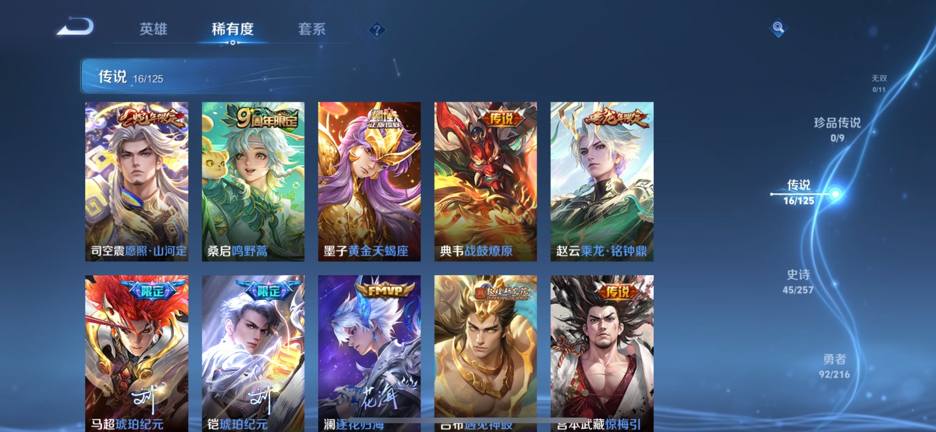 刘备时之恋人,铠琥珀纪元,赵云乘龙·铭钟鼎,典韦战鼓燎原,达摩黄金狮子座,吕布遇见神鼓,宫本武藏惊梅引,曜云鹰飞将,马超琥珀纪元,李元芳飞鸢探春,墨子黄金天蝎座,澜逐花归海,虞姬云霓雀翎