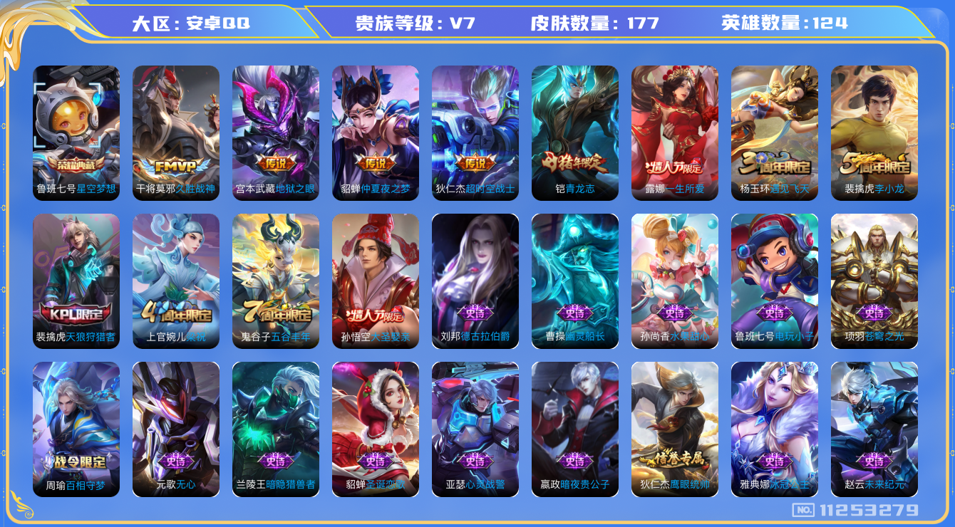 - [11607322]V7 1典藏 1珍品传说 8传说 124英雄 205皮肤 可修改实名 优质装备:弑枪猎影(韩信典藏),器灵·落星盏,猫影幻舞,一念神魔,末日机甲-孙策 传说皮:幻光神枪 珍宝阁皮:优雅恋人,蔷薇恋人,女武神 限定皮:愿照·岁时盈(虞姬年限),逐霄战戟,至尊宝,武陵仙君(小桃花),飞衡(韩信年限),高山流水,诗剑行,怒海麟威,五谷丰年,游园惊梦,岱宗(典韦年限),孙行者,引擎之心 史诗皮:器灵·浮梦炉,化蝶舞,星界战将,龙之律动,茶境仙,百相守梦-百里守约,紫霞仙子,苍穹之光,黄金分割率,特工魅影,江河有灵,蒙恬荣光圣徽,偶像歌手,暗夜猫娘,末日机甲-吕布,猫狗日记-孙策,时之恋人-孙尚香,乱世虎臣,节奏热浪,女仆咖啡,摇滚巨星,水果甜心,绅士熊喵,天才门将,星夜王子,心灵骇客,功夫厨神,德古拉伯爵,暗隐猎兽者,幽灵船长,鬼剑武藏,心灵战警,舞动绿茵,地狱岩魂,纤云弄巧,拒霜思,缤纷独角兽,乘风破浪,逐浪之夏,水晶猎龙者,金属风暴,原初追逐者,圣诞恋歌,鹰眼统帅,魅力维加斯,黎明之约,无心,未来纪元-赵云