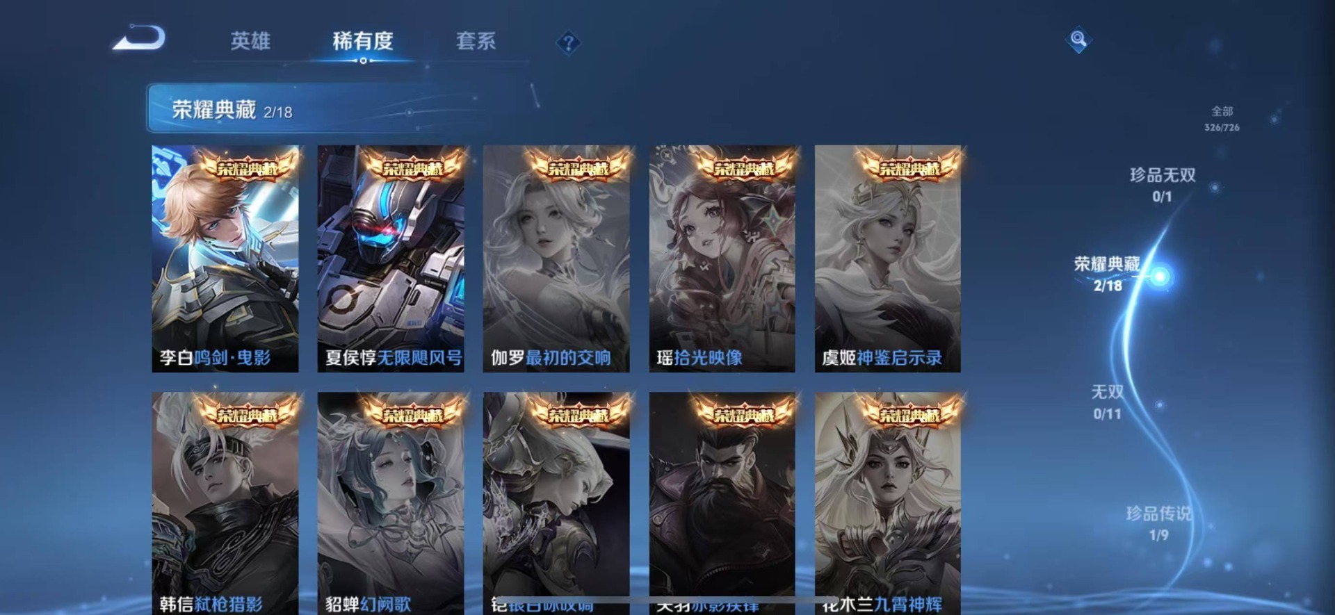 黄忠烈魂,铠青龙志,张飞虎魄,赵云龙胆,小乔纯白花嫁,孙尚香异界灵契,后羿如梦令,后羿辉光之辰,周瑜真爱至上,诸葛亮时雨天司,兰陵王影龙天霄,裴擒虎李小龙,上官婉儿梁祝,上官婉儿天狼绘梦者,李白诗剑行,马可波罗山海·玄木吟,桑启鸣野蒿,猪八戒猪悟能,孙悟空大圣娶亲,孙悟空至尊宝,百里玄策白虎志,马超神威,盘古冰霜神祇,百里守约朱雀志,澜愿照·九州拓,嫦娥如梦令,关羽冰锋战神