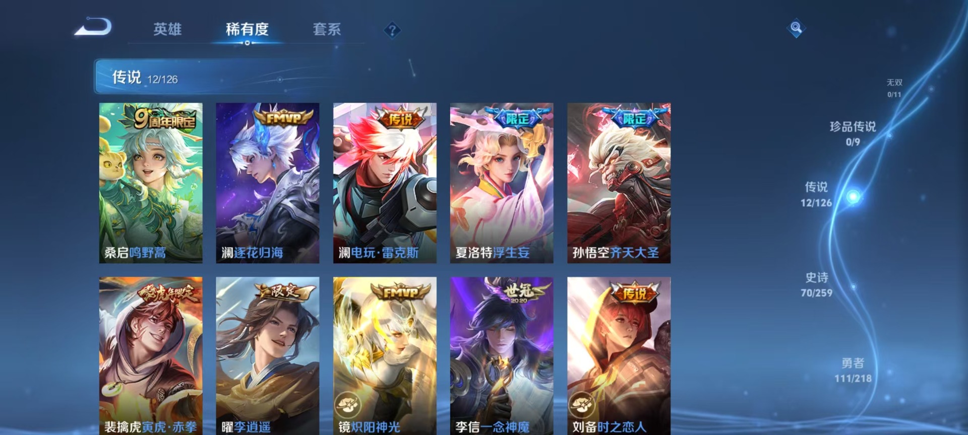 - [11683726]V8 2典藏 2珍品传说 21传说 126英雄 293皮肤 典藏英雄武则天 可修改实名 优质装备:鸣剑·曳影,拾光映像(瑶典藏),大耳狗之梦,黄金狮子座,冠军飞将,久胜战神,云霓雀翎,仲夏夜之梦(大飞蛾),音你心动-小乔,海洋之心,胖达荣荣,淬星耀世,音你闪耀(rap皮),神器·狴犴令,山海·炽霜斩(李信年限),追逃游戏(亚瑟),电玩·雷克斯,永恒水手月亮 珍品传说:兔狲·蓬尾 传说皮:云诺千山,幻光神枪 珍宝阁皮:妄想食味,玩趣恶龙 限定皮:凤求凰(白切鸡),前尘镜,遇见飞天,怒海麟威,五谷丰年,梁祝,烈魂,天狼绘梦者,朱雀志(守约年限),辉光之辰,如梦令-嫦娥,孙行者,乒乒小将,唐三藏,时之奇旅-妲己,山海·玄木吟(马可年限) 史诗皮:鸭鸭历险记-刘禅,龙之律动,石田雨龙,茶境仙,蔬乡物语(鲁班七号),紫霞仙子,特工魅影,千年之狐,永昼,电玩·爆裂旋风,江河有灵,百解令(蒙犽),高渐离燃音魔法,蒙恬荣光圣徽,偶像歌手,龙骑士(小龙虾),白蛇,暗夜猫娘,青蛇,末日机甲-吕布,猫狗日记-孙策,乱世虎臣,节奏热浪,修罗,女仆咖啡,摇滚巨星,水果甜心,星夜王子,心灵骇客,功夫厨神,德古拉伯爵,暗隐猎兽者,幽灵船长,鬼剑武藏,心灵战警,乐园奇幻夜,地狱岩魂,诗语江南,纤云弄巧,繁星吟游(呼啦呼啦),拒霜思,缤纷独角兽,乘风破浪,逐浪之夏,水晶猎龙者,曙光守护者,热力回旋,箭羽风息,唤灵魅影,金属风暴,圣诞狂欢,圣诞恋歌,鹰眼统帅,王者之锤,暗夜贵公子,黎明之约,滕王阁序,顽趣-阿古朵,无心,未来纪元-赵云
