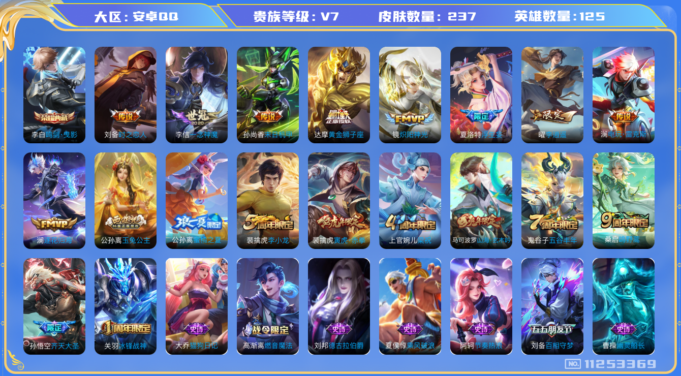 [11253369]V7 1典藏 12传说 125英雄 237皮肤 可修改实名 优质装备:鸣剑·曳影,黄金狮子座,炽阳神光,一念神魔,末日机甲-孙尚香(绿蚂蚱),李逍遥,时之恋人-刘备(电焊工),浮生妄,电玩·雷克斯,澜逐花归海 珍宝阁皮:胡桃夹子,蔷薇恋人,女武神 限定皮:鸣野蒿,齐天大圣,五谷丰年,冰锋战神,梁祝,李小龙,蜜橘之夏,寅虎·赤拳(老虎年限),玉兔公主,山海·玄木吟(马可年限) 史诗皮:龙之律动,石田雨龙,蔬乡物语(鲁班七号),紫霞仙子,苍穹之光,电玩小子(小书包),白龙吟,特工魅影,千年之狐,百相守梦(刘备),电玩·爆裂旋风,江河有灵,百解令(蒙犽),高渐离燃音魔法,蒙恬荣光圣徽,偶像歌手,晚萤,末日机甲-吕布,猫狗日记-孙策,猫狗日记-大乔,时之恋人-孙尚香,乱世虎臣,节奏热浪,修罗,女仆咖啡,水果甜心,天才门将,星夜王子,德古拉伯爵,暗隐猎兽者,幽灵船长,鬼剑武藏,心灵战警,舞动绿茵,纤云弄巧,拒霜思,乘风破浪,逐浪之夏,水晶猎龙者,热力回旋,金属风暴,原初追逐者,圣诞狂欢,圣诞恋歌,鹰眼统帅,暗夜贵公子,魅力维加斯,赏金猎手,无心,未来纪元-赵云