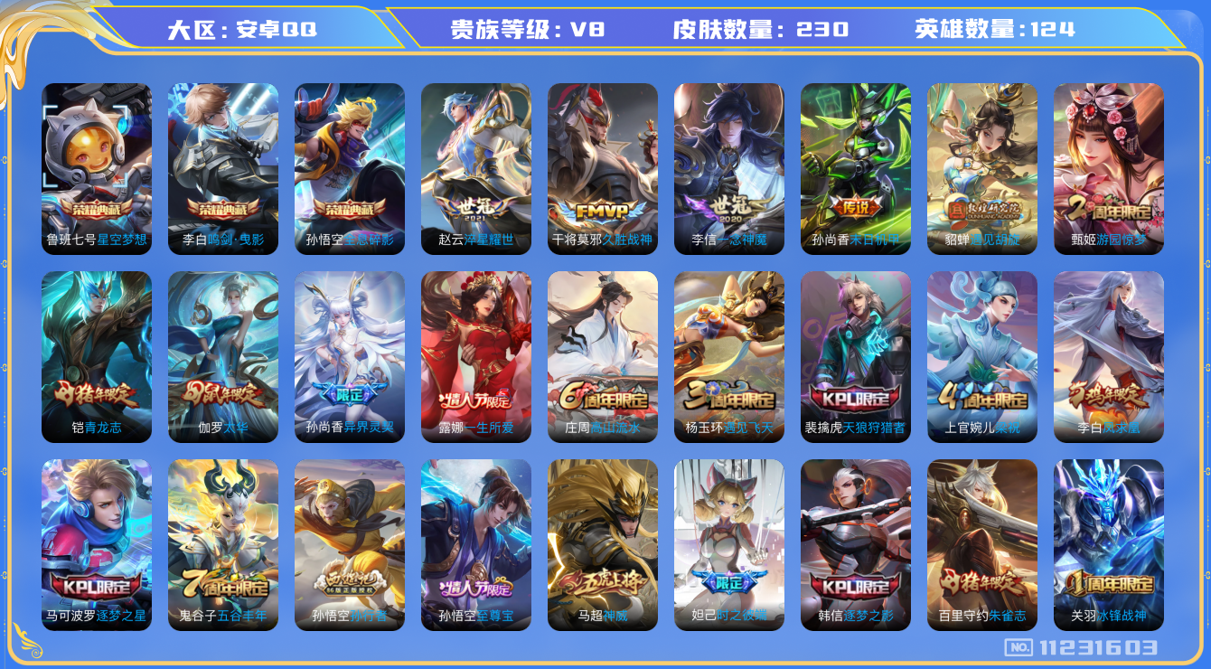 [11231603]V8 3典藏 9传说 124英雄 230皮肤 可修改实名 荣耀水晶:鸣剑·曳影,全息碎影(猴子典藏),星空梦想(太空人) 传说皮:遇见胡旋,末日机甲-孙尚香(绿蚂蚱),一念神魔,淬星耀世,久胜战神 限定皮:至尊宝,凤求凰(白切鸡),太华(伽罗年限),异界灵契(白毛香),时之彼端,神威(电光马子),遇见飞天,高山流水,五谷丰年,青龙志(铠年限),冰锋战神,游园惊梦,梁祝,天狼狩猎者,逐梦之星,逐梦之影,朱雀志(守约年限),孙行者,一生所爱 史诗皮:紫霞仙子,电玩小子(小书包),白龙吟,黄金分割率,千年之狐,高渐离燃音魔法,冰冠公主,晚萤,魅语,暗夜猫娘,猫狗日记-大乔,节奏热浪,修罗,女仆咖啡,摇滚巨星,水果甜心,时之奇旅-安琪拉,功夫厨神,德古拉伯爵,暗隐猎兽者,幽灵船长,鬼剑武藏,暗渊魔法,舞动绿茵,纤云弄巧,拒霜思,乘风破浪,逐浪之夏,水晶猎龙者,曙光守护者,金属风暴,原初追逐者,圣诞狂欢,圣诞恋歌,鹰眼统帅,王者之锤,暗夜贵公子,魅力维加斯,无心