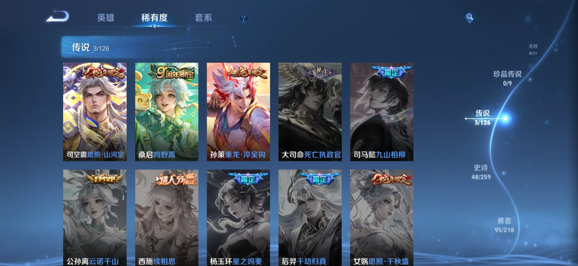 - PX_2057229-贵族等级: V4 英雄数: 97 皮肤数: 64 传说皮: 冠军飞将,时之恋人-刘备,无双飞将,幻光神枪 限定皮: 异界灵契,五谷丰年