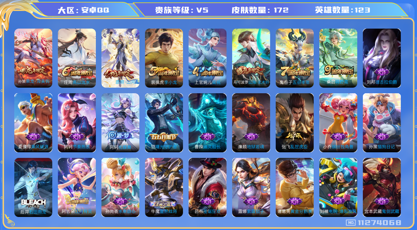[11274068]V5 3传说 123英雄 172皮肤 可修改实名 传说皮:乘龙·淬吴钩(孙策年限) 珍宝阁皮:胡桃夹子,蔷薇恋人 限定皮:愿照·山河定(司空震年限),鸣野蒿,高山流水,五谷丰年,梁祝,李小龙,山海·玄木吟(马可年限) 史诗皮:化蝶舞,龙之律动,石田雨龙,星界战将,蒙犽顽岩魄,紫霞仙子,黄金分割率,千年之狐,电玩·爆裂旋风,江河有灵,蒙恬荣光圣徽,无限星赏官,冰冠公主,偶像歌手,猫狗日记-孙策,乱世虎臣,节奏热浪,女仆咖啡,水果甜心,功夫厨神,德古拉伯爵,暗隐猎兽者,幽灵船长,鬼剑武藏,心灵战警,地狱岩魂,拒霜思,缤纷独角兽,乘风破浪,水晶猎龙者,曙光守护者,金属风暴,原初追逐者,圣诞狂欢,鹰眼统帅,魅力维加斯,未来纪元-赵云