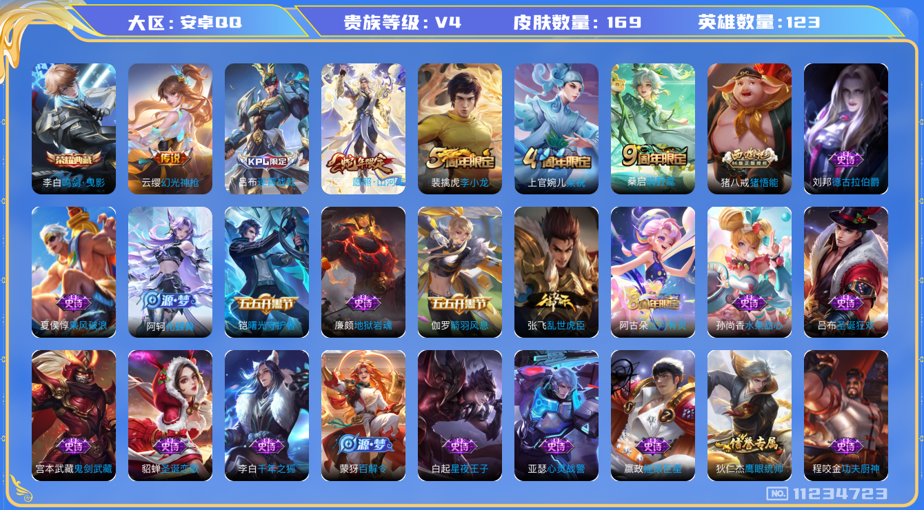 [11234723]V4 1典藏 3传说 123英雄 169皮肤 可修改实名 荣耀水晶:鸣剑·曳影 传说皮:幻光神枪 珍宝阁皮:妄想食味,蔷薇恋人 限定皮:愿照·山河定(司空震年限),逐霄战戟,鸣野蒿,梁祝,李小龙,猪悟能 史诗皮:龙之律动,化蝶舞,白龙吟,千年之狐,江河有灵,百解令(蒙犽),冰冠公主,乱世虎臣,女仆咖啡,摇滚巨星,水果甜心,星夜王子,功夫厨神,德古拉伯爵,鬼剑武藏,心灵战警,地狱岩魂,乘风破浪,逐浪之夏,曙光守护者,箭羽风息,金属风暴,圣诞狂欢,圣诞恋歌,鹰眼统帅