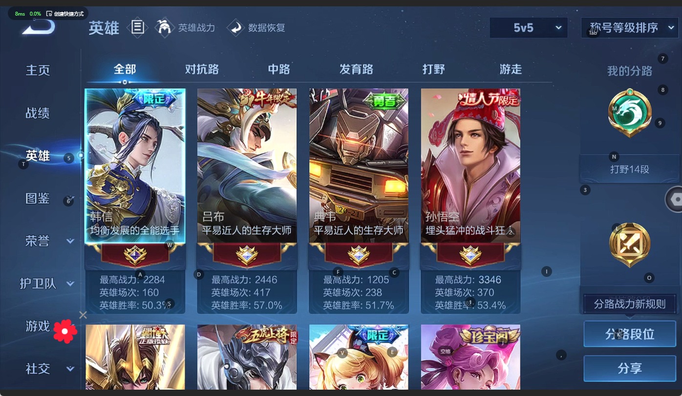 - PX_2087192-安卓Q 【可二次】 英雄数量:122 皮肤数量:277 贵族等级:贵族V8 无双限定1 荣耀典藏3 传说品质31 史诗品质82真我赫兹瑶 幻阙歌 天鹅之梦 杀手不太冷 愿照·岁时盈 朵莉亚心动手记 时之祈愿女 挚爱花嫁 仲夏夜之梦 游龙清影 追逃游戏女 曦玄引女 永曜之星 无双飞将 寅虎赤拳 幻光神枪 愿照·众生和 小动物乐团 绯月行 久胜战神 末日机甲女 前尘镜 启示之音